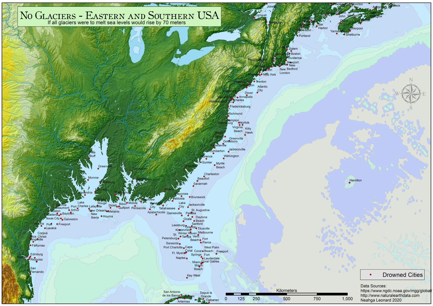 해수면이 70 미터 상승한 미국 동부 및 남부