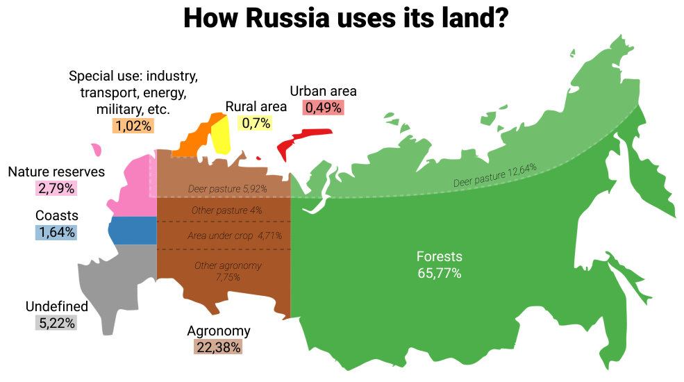 아마존 열대우림과 함께 러시아의 숲은 지구의 허파이다. 러시아 영토의 약 66%는 숲으로 덮여 있고, 22%는 농작물이 차지하고 있다. 러시아 영토의 거의 13%는 사슴 방목지로, 주로 북극권 안에 있는 토착 시베리아 사슴 사냥꾼들의 땅이다.
