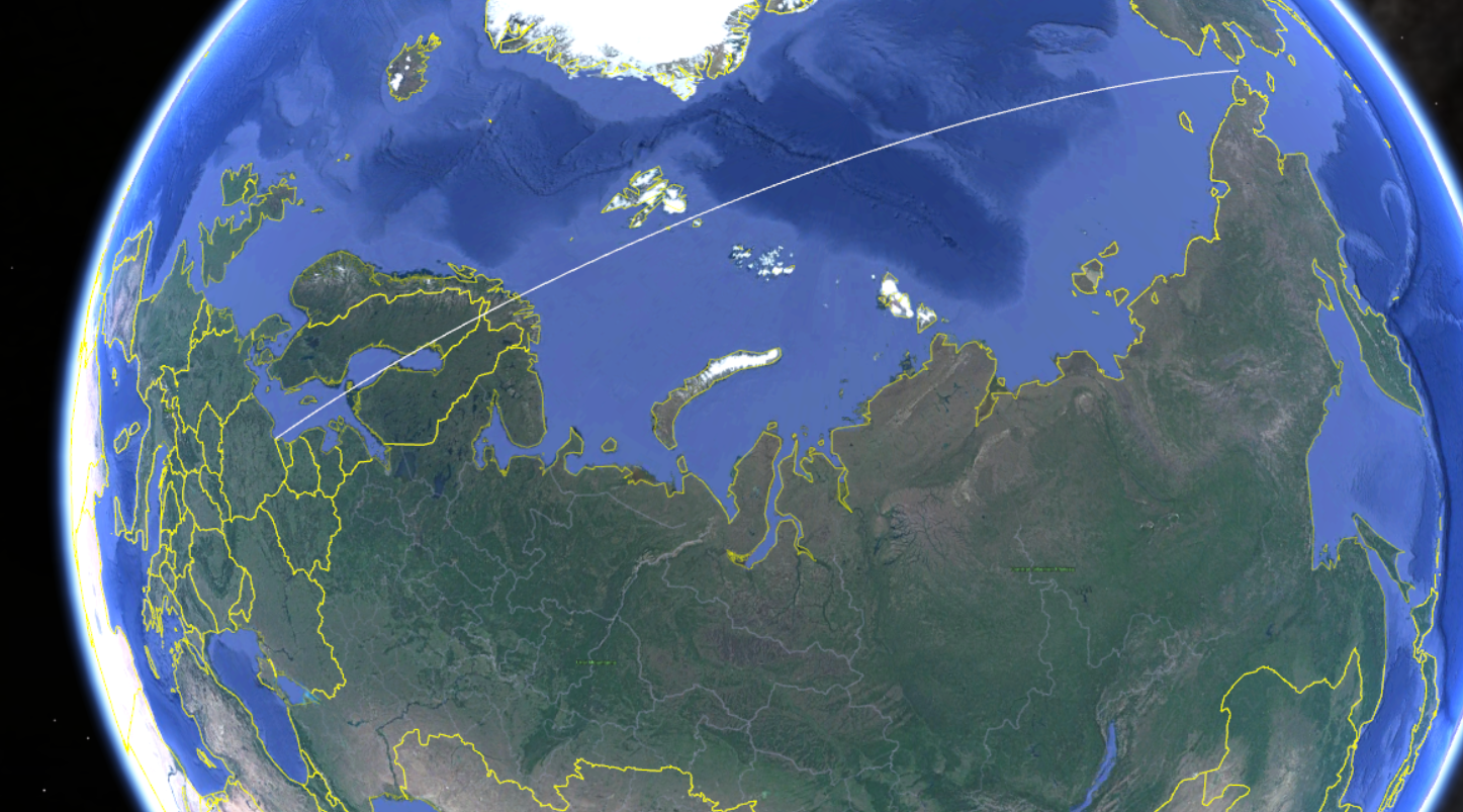 러시아의 서쪽 끝과 동쪽 끝 지점을 잇는 직선은 러시아 땅을 전혀 통과하지 않는다!