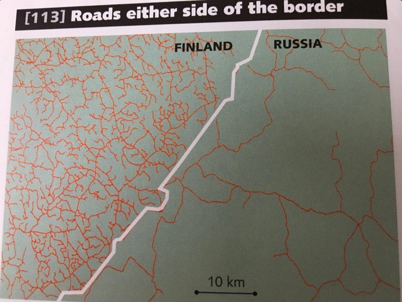 러시아의 총 도로망 규모(150만 km)는 미국(690만 km), 인도(590만 km), 중국(500만 km), 브라질(180만 km)에 이어 5위이다. 그러나 나라의 거대한 규모 때문에 러시아의 유럽 부분에서도 도로망 밀도는 다른 나라의 도로망 밀도에 비해 크게 떨어진다. 아래 지도는 핀란드-러시아 국경 양쪽에 있는 도로를 보여준다.