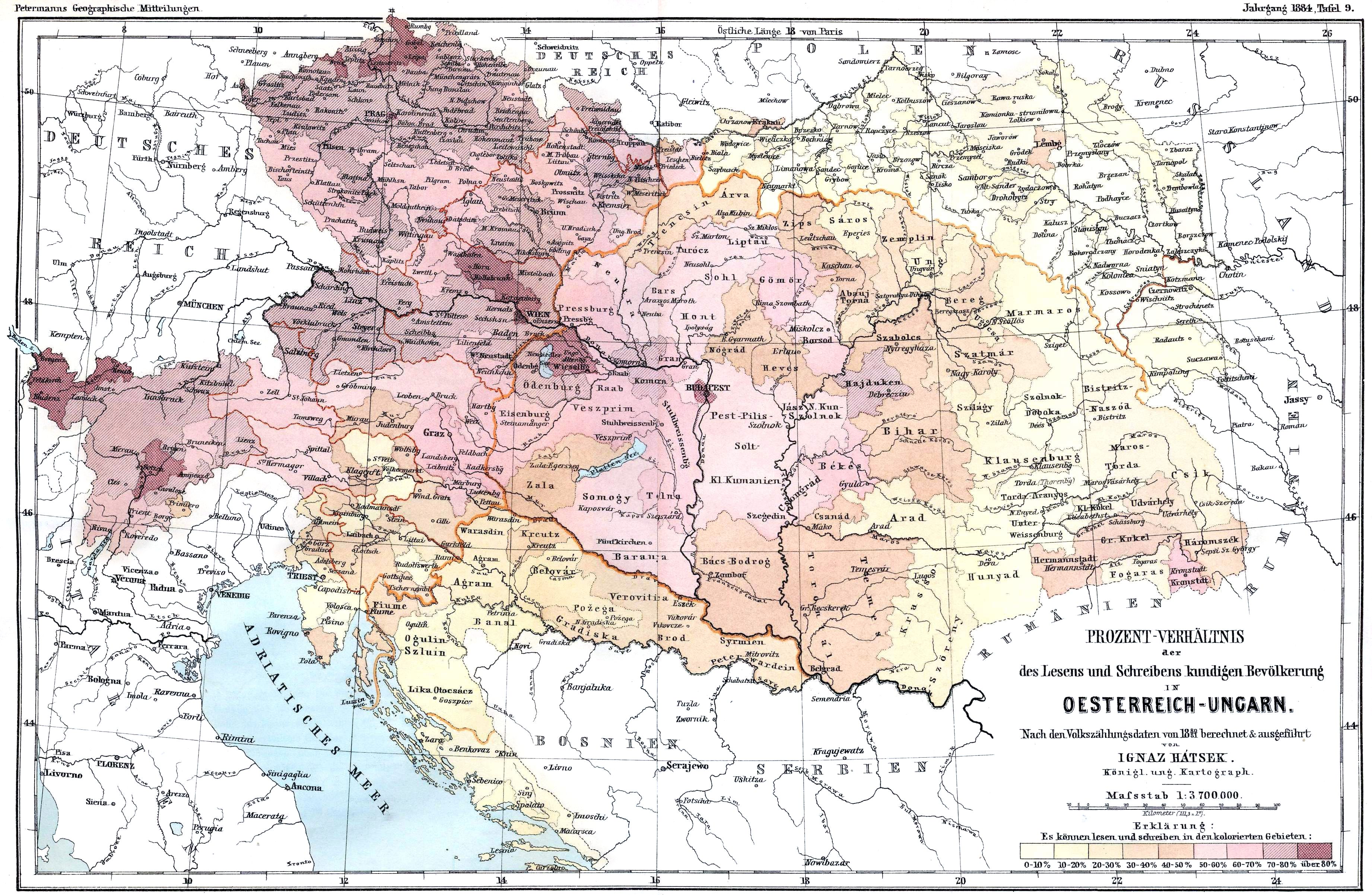 1910년 오스트리아 서부 지방에서는 식자율이 90%를 넘었고, 헝가리는 아직 50%가 되지 않았으며 서쪽에서 동쪽으로 70-30% 사이였다.