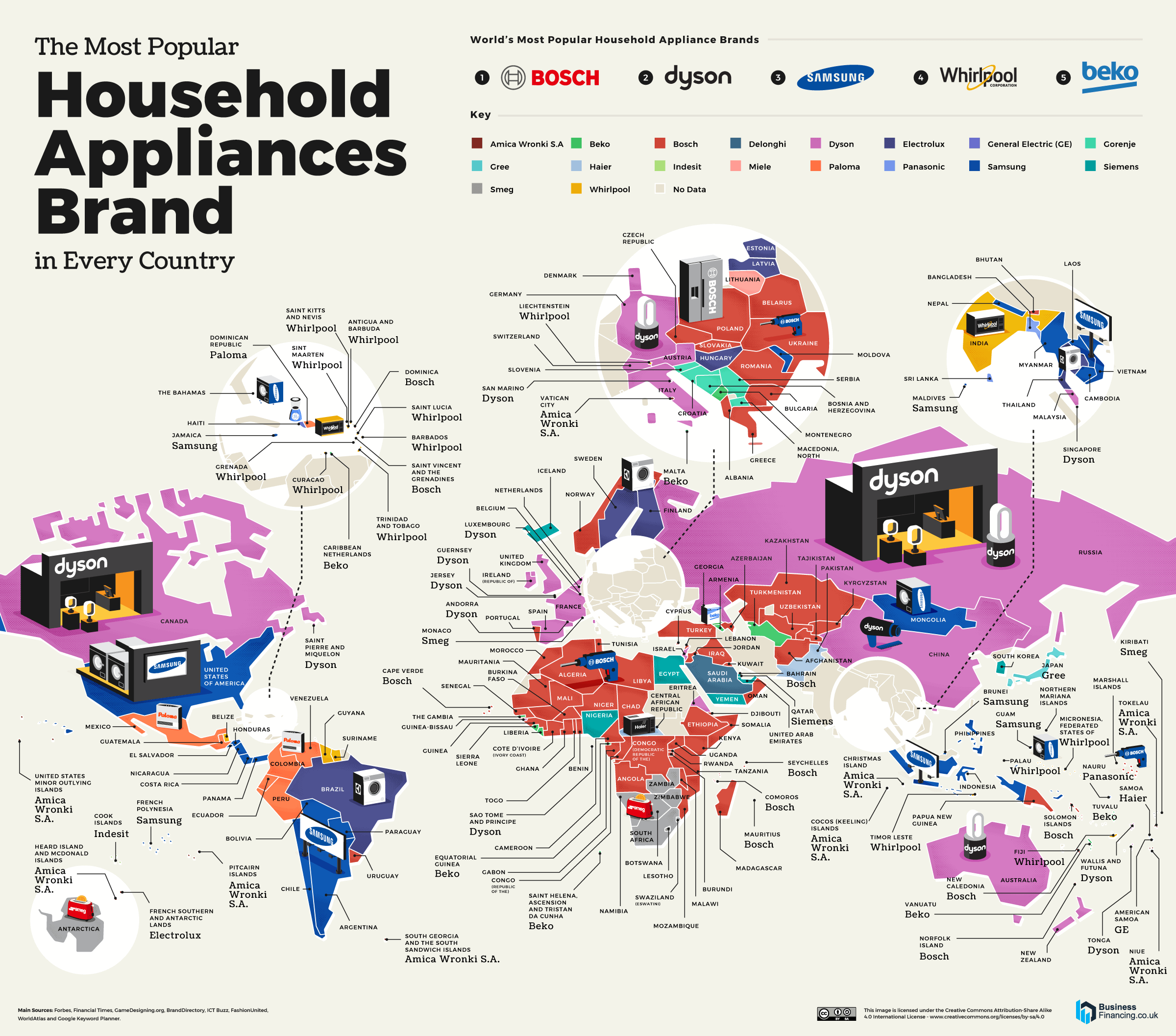 이 분야에서 독일 가전업체 보쉬는 69개국에서 가장 많이 검색된 브랜드이다. 하지만 2위 다이슨(30개국)의 검색량은 1,142,285건으로 보쉬의 883,085건보다 더 많다. 놀랍게도, 삼성은 26개 국가에서 1위 가전 브랜드로서 3위를 차지했다.
