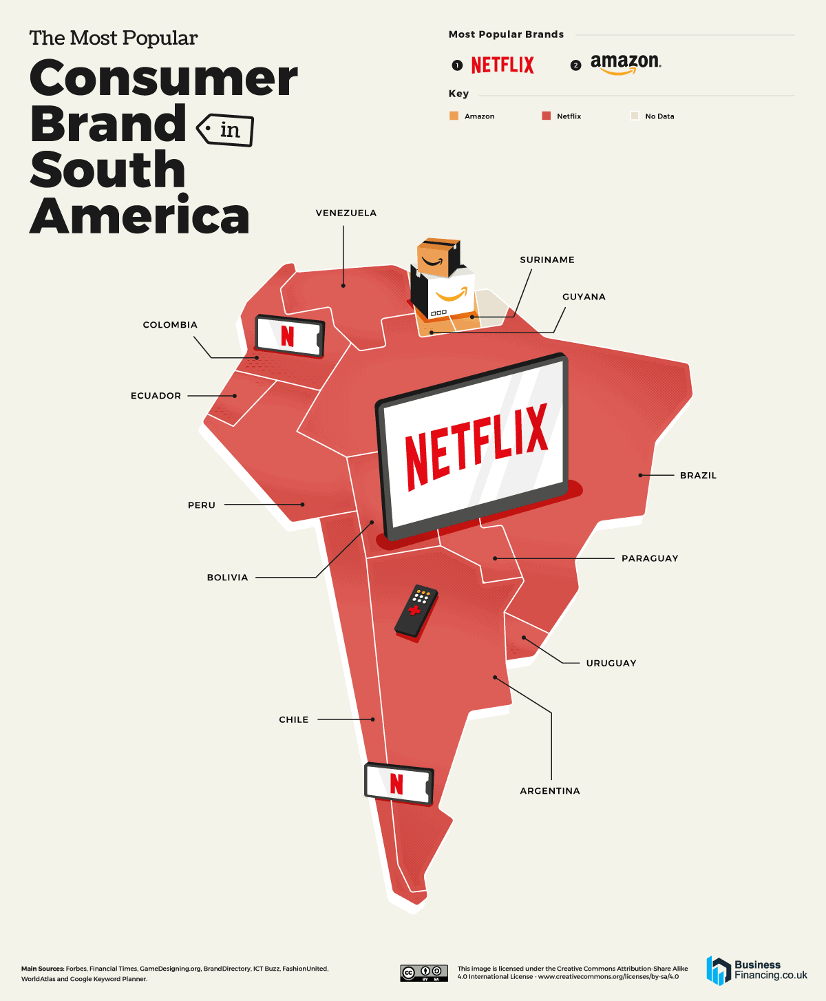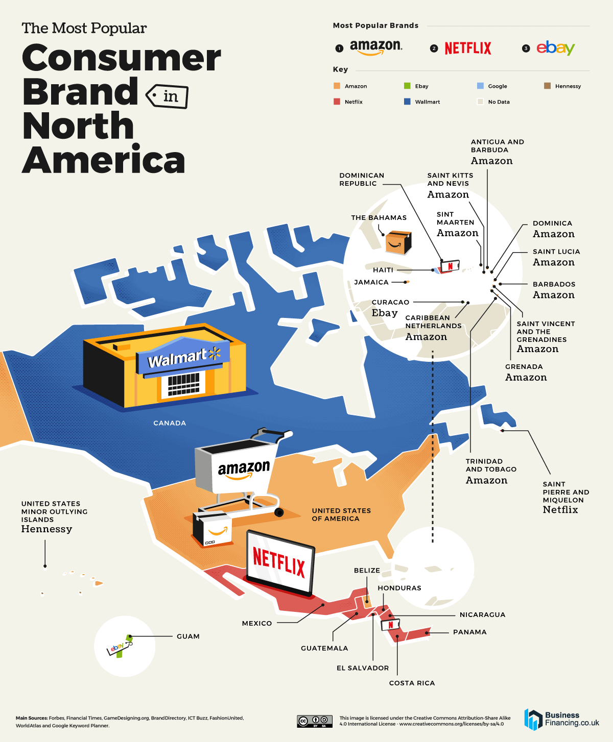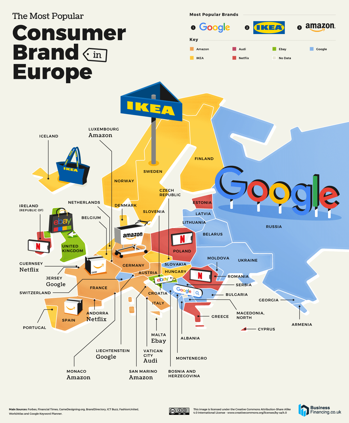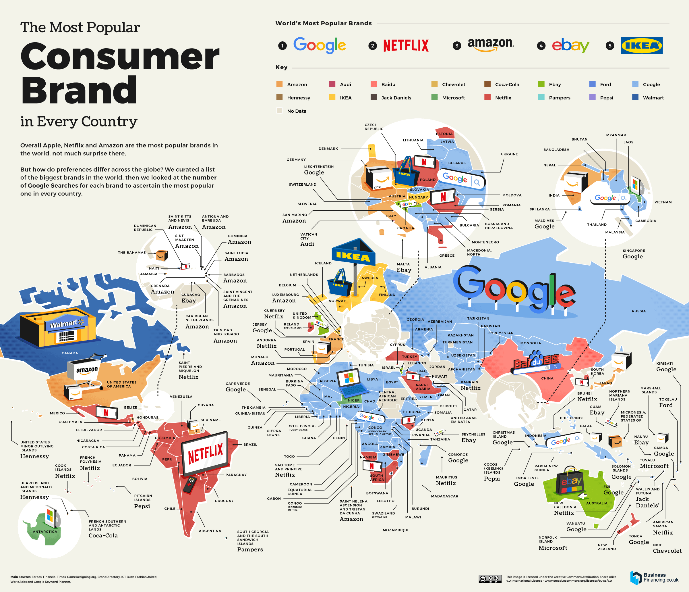 세계에서 가장 인기 있는 소비자 브랜드는 압도적으로 온라인 회사이고, 압도적으로 미국의 것이다. 실제로, 상위 4개 브랜드(브랜드가 가장 많이 검색된 국가의 수로 측정)는 구글(100개국), 넷플릭스(45개국), 아마존(30개국), 이베이(11개국)와 같은 미국의 웹 서비스이다. 아마존이 18개국에만 존재하는 것을 고려하면 더욱 주목할 만하다. 하지만 다섯 번째로 인기 있는 브랜드는 스웨덴의 가구 회사인 IKEA이다. 상위 4개 기업처럼 브랜드 이름 자체가 자사 제품/서비스와 동의어가 됐다.