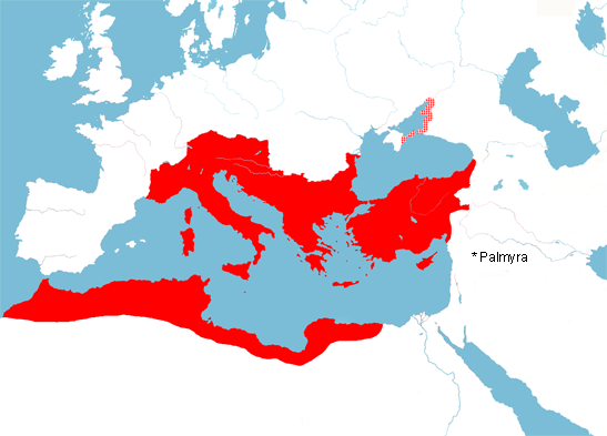 트라야누스의 동방 정복은 유지하기 어려웠고, 그의 후계자 하드리아누스(117-138년)는 아르메니아가 여전히 클리엔테스 국가로 남아있었지만, 즉시 국경 지역을 유프라테스 강으로 되돌렸다. 팍스 로마나는 마지막 입양 황제인 아우렐리우스의 아들 콤모두스가 살해될 때까지 지속되었다. 이어진 내전(193-97년)은 세베루스가 승리하였으며 그의 왕조는 235년까지 안정을 유지했다. 그러나 정복과 약탈로 부자가 된 제국에게 평화가 반드시 번영을 의미하지는 않았다. 주화는 약 170년부터 반복적으로 평가절하되었고, 이 지도의 시점에서 은 함유량은 몇 퍼센트 되지 않았다(내전과 불확실성으로 안토니아누스 은화(2 데나리우스 가치)의 은 함유량이 2%까지 하락). 212년, 제국의 모든 자유민이 시민이 되었고, 이는 세금 기반을 늘리기 위한 시도였다. 경제 쇠퇴와 함께 정치적 불안이 찾아왔다. 235년 이후 반세기 동안 15명의 황제가 있었고, 대부분 몇 년 동안만 통치했다. 동시에, 로마의 적들은 더욱 강력해졌다. 226년 동방에서 파르티아는 700년 전 페르시아 제국의 영광을 되찾고자 했던 사산조 페르시아에 의해 대체되었다. 그들은 253년 안티오케이아를 약탈하고 260년에는 에데사에서 발레리아누스 황제를 포로로 잡았다. 동시에 게르만족은 제국 깊숙이 쳐들어와 여러 지점에서 지중해에 도달했다. 제국의 무력함으로 인해 지역 사령관들이 최악의 영향을 받은 지역에서 통제권을 장악하도록 만들었다. 서쪽에서, 260년 포스투무스는 스페인과 브리튼을 포함한 갈리아 제국을 세웠다. 동쪽에서는 반독립적인 무역도시 팔미라가 저항의 중심지가 되었다. 도시의 통치자 오데나투스는 페르시아군을 물리치고 그들의 수도 크테시폰을 약탈하기도 했다. 267년 그가 죽자, 더 야심 찬 미망인 제노비아가 권력을 잡고 269년까지 로마 시리아, 팔레스타인, 이집트를 통치했다.