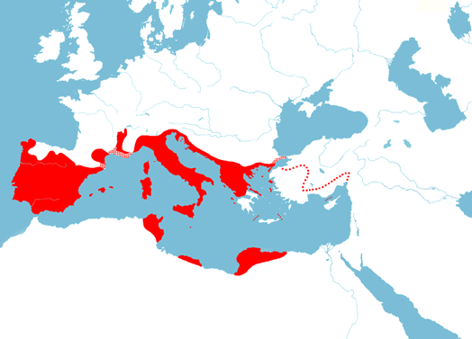 그의 승리에도 불구하고 한니발은 로마로 진격할 준비가 되어 있지 않았고, 로마 군단은 마침내 BC 211년에 그를 상대로 승리를 거두었다. 다른 곳에서도 로마군이 우위를 점하고 있었다. 203년 한니발은 로마군의 공격으로부터 카르타고를 방어하기 위해 이탈리아에서 철수했다. 202년 그곳에서 그는 로마 장군 스키피오에게 패했고, 전쟁은 카르타고에 가혹한 조건이 부과되면서 끝이 났다. 로마는 스페인의 동부 해안 전체를 획득했고, 133년까지 스페인의 대부분을 정복했다. 여느 때처럼 로마는 대부분의 시간을 전쟁으로 보냈고, 로마 군단은 모든 곳에서 결국 성공했다. 마케도니아는 148년에, 그리스와 카르타고는 2년 후에 합병되었다. 이 시기에 로마 시의 인구는 10만 명에 이르렀고, 경쟁도시는 급격히 위축되고 있는 셀레우코스 왕국의 수도인 안티오케이아와 이집트 프톨레마이오스 왕국의 수도인 알렉산드리아뿐이었다. 로마의 위신은 아나톨리아 서부의 페르가몬 왕이 피할 수 없는 일에 굴복하고 133년 그의 왕국을 로마에 물려줄 정도였다. 100년경 로마의 동방 영토는 위의 지도에서 점선 경계까지 뻗어 있었다. 로마의 패권에 도전한 왕국은 흑해 남쪽 해안에 있는 폰토스뿐이었다. 110-100년 사이에 미트리다테스 왕(120-66년)은 동쪽과 남쪽(중앙 아나톨리아의 로마 보호령들을 일시적으로 정복) 및 북쪽(흑해 북쪽 해안에 있는 보스포루스 왕국을 정복)으로 확장하여 영토를 4배 이상 늘렸다. 88년, 이탈리아가 "동맹시 전쟁"(로마에게 시민권을 이탈리아 전체로 확대하도록 강요한)에서 막 벗어나고 있을 때, 미트리다테스는 서쪽으로 진격했다. 로마의 아시아 속주를 덮쳤고 6만 명의 로마인이 처형당했다. 86년, 그리스 남부가 미트리다테스에게 귀순하여 폰토스 군대를 받아들였다. 동방에서 로마의 전략적 거점이 무너지고 있는 것처럼 보였다.
