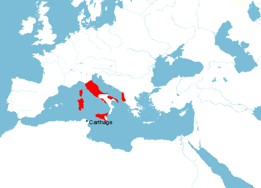 로마인은 BC 275년에 결국 피로스를 이겼고, 272년에는 이탈리아 남부 전체를 확보했다. 로마의 다음 공격 대상은 카르타고 해양 대제국이었다. 264-241년의 제1차 포에니 전쟁(카르타고가 원래 포에니인, 즉 페니키아의 식민지였기 때문에 그렇게 불렸다)은 카르타고의 패배로 끝났다. 지중해 서부의 시칠리아 섬, 사르데냐 섬, 코르시카 섬은 로마에 양도되었다. 로마는 220년대에 해적 퇴치 캠페인을 통해 아드리아 해 건너편의 영토를 획득했고, 동시에 이탈리아 북부의 켈트족을 정복했다. 한편, 카르타고는 스페인의 많은 지역을 정복함으로써 입지를 다시 다졌고, 218년 이곳에서 제2차 포에니 전쟁이 시작되었다. 이번에는 생존을 위한 전쟁이었다. 카르타고의 위대한 장군 한니발은 스페인에서 로마군을 물리치고 알프스 산맥을 넘어 이탈리아를 침공했다. 그곳에서 그는 로마 군단에게 패배를 거듭해서 안겨주었는데, 최악의 상황은 216년 로마 군단이 약 5만 명의 군단병을 잃은 칸나이에서였다. 피로스 침공 때처럼 삼니움족과 그리스 남부가 그에게 귀순했고, 214년 시칠리아에서 시라쿠사이(시라쿠사)가 뒤를 이었다.