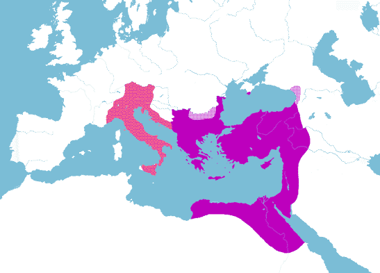 375년 서고트족은 중앙아시아에서 유럽으로 침입한 훈족을 피해 다뉴브 강 남쪽에 정착하는 것이 허용되었다. 푸대접을 받은 그들은 378년에 반란을 일으켜 그들에게 맞서도록 파견된 제국 군대를 격파했다. 로마 신민들이 군대 복무를 점점 꺼리자 제국은 서고트족을 시작으로 게르만 부족들로 대부분 대체하기 시작했으며, 395년 동서방 전체의 마지막 황제인 테오도시우스가 죽고 제국을 두 아들에게 나누었다. 이 상황을 이용하여 서고트족은 395년에 다시 반란을 일으켰다. 그들은 결국 이탈리아를 침공하여 410년에 로마를 약탈했다. 한편, 반달족과 수에비족이 라인 강을 건너 침공했고, 브리튼은 반란을 일으켰다. 서방 제국은 420년에 다소 회복되었지만, 430년대에 반달족이 아프리카를 점령하면서 경제적으로 큰 타격을 입었다. 그들의 마지막 위대한 장군 아이티우스 휘하에서, 서방은 게르만 동맹들의 도움으로 451년 갈리아에서 훈족을 격퇴할 수 있을 정도로 충분한 힘을 가졌다. 그 후 돌이킬 수 없는 쇠퇴기에 접어들었고, 476년에는 이탈리아 외에 영토가 거의 없었다. 그 해에 마지막 서방 황제인 로물루스는 그의 군사령관 오도아케르에 의해 폐위되었다. 20년 동안 재임한 전임자들과 마찬가지로, 오도아케르는 게르만족 태생이었고, 이제는 스스로를 이탈리아의 왕이라고 칭했다. 오도아케르는 동방의 제노 황제의 이름으로 통치한다고 주장했다. 동방은 항상 더 부유한 반쪽이었고, 게르만족과 훈족의 침략에서 대부분 무사히 살아남았다. 처음에 제노는 오도아케르의 제안을 받아들이지 않았지만, 480년에 황제는 그에게 파트리키 칭호를 부여했고, 483년부터는 로마 원로원이 황제 밑에서 했던 것처럼 두 집정관 중 한 명을 임명하도록 허용했다. 485년경의 이 기이한 상황은 위 지도의 색상으로 표시된다. 오도아케르의 왕국은 옅은 빨간색을 띠고 있는데, 왕국은 실제로 서로마 제국의 계승자였지만 그렇게 주장하지는 않았다. 하지만 왕국은 명목상 통일 제국의 일부였기 때문에 점묘 보라색이 칠해져 있기도 하다.