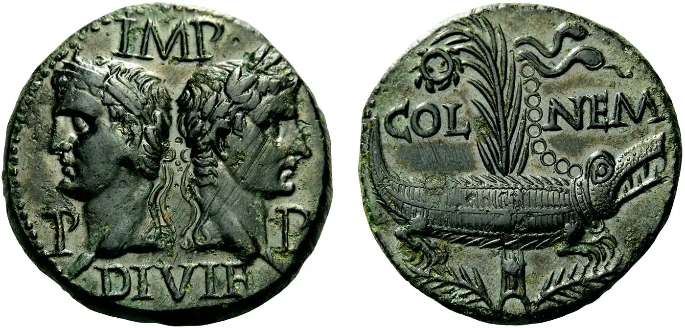 네마우수스(님)에서 주조된 두폰디우스(1/2 세스테르티우스, 오리칼쿰 또는 놋쇠/적갈색 구리로 주조)는 아우구스투스와 그의 친구 아그리파가 함께 있는 초상(앞면)과 종려나무 가지에 묶여 있는 악어(이집트 정복을 상징)가 뒷면에 그려져 있다, BC 9-3년