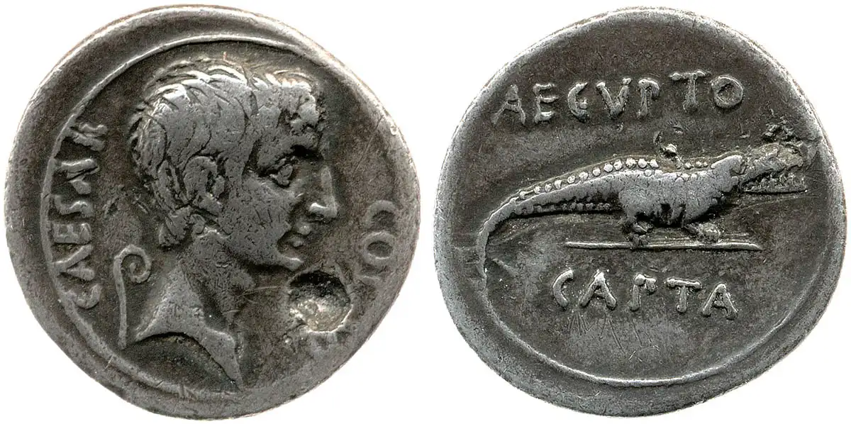 프톨레마이오스 왕국의 몰락으로 이집트는 로마의 손에 넘어갔다. 다른 속주와는 달리, 로마 이집트는 황제의 사유지이자 로마의 빵 바구니가 되었다. 부유한 지중해 지역의 정복과 병합을 기념하기 위해 BC 28-27년에 옥타비아누스는 정복을 명백하게 찬미하는 최초의 로마 주화인 일련의 금화와 은화를 발행했다. 다른 고대 화폐와 마찬가지로, 주화 앞면에는 통치자(옥타비아누스)의 초상이 새겨져 있다. 그러나 뒷면은 참신하다. 보는 이에게 명확하게 보이는 이 글자 새김은 AEGVPTO CAPTA(점령된 이집트)를 자랑스럽게 선언하고 있다. 수반되는 해머로 치는 악어 이미지는 정복의 중요성을 잘 보여준다. 나일악어는 고대 이집트의 상징이었다. 게다가, 고대 이집트인들은 이 큰 파충류를 악어 머리의 신 소베크의 자식으로 여겼다. 그는 역대 파라오와 프톨레마이오스 통치자들의 수호자였다.