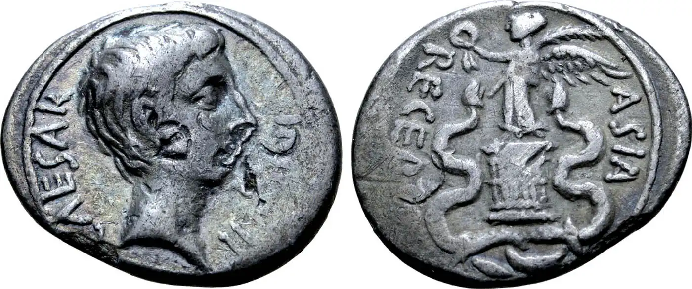 메시지를 묘사하기 위해 선택된 모티브는 키스타 미스티카로, 뱀 두 마리가 옆에 있고 위에는 승리의 형상이 그려져 있다. 승리의 이미지는 자명하다. 이는 소아시아에 살고 있는 그리스인을 위한 주요 모티브로 데려다준다. 키스타 미스티카는 살아있는 뱀이 들어 있는 성스러운 상자로, 디오니소스의 비밀 의식에 사용되는 의식용 도구였다. 또한 많은 아시아 도시에서 그들의 은화 뒷면 디자인으로 채택한 모티브였다. 따라서 로마 주화에 등장한 것은 헬레니즘 도시들의 권리와 관습을 보존하고 새로운 관리 아래에서 번영하는 밝은 미래를 보장했다.