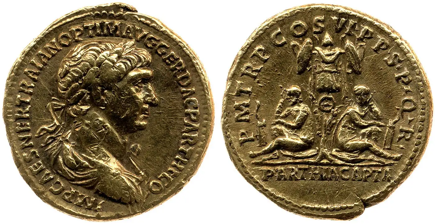 동방에서 성공적인 원정을 수행한 몇 안 되는 로마 지도자 중 한 명이 트라야누스 황제였다. 115-117년 원정에서 트라야누스는 파르티아 제국을 격파하고 로마 군단을 페르시아만 해안으로 이끌었다. 이 눈부신 업적을 기념하기 위해, 트라야누스는 특별 금화를 발행하기로 결정했다. 116년에 주조된 로마 주화에는 PARTIA CAPTA(정복된 파르티아)가 자랑스럽게 선언되어 있다. 글에는 노획한 무기와 갑옷의 트로파이움을 사이에 두고 앉아 있는 구속된 포로의 일반적인 이미지가 수반되어 있다. 불행하게도, 트라야누스의 승리는 로마 제국을 과도하게 확장시켰다. 로마인은 페르시아만 주변의 영토를 점령하지 않고, 대신 유프라테스 강으로 철수했다. 파르티아는 결국 회복되었고, 훨씬 더 위험한 사산 제국으로 대체되기 전까지 한 세기 이상 로마를 괴롭혔다.