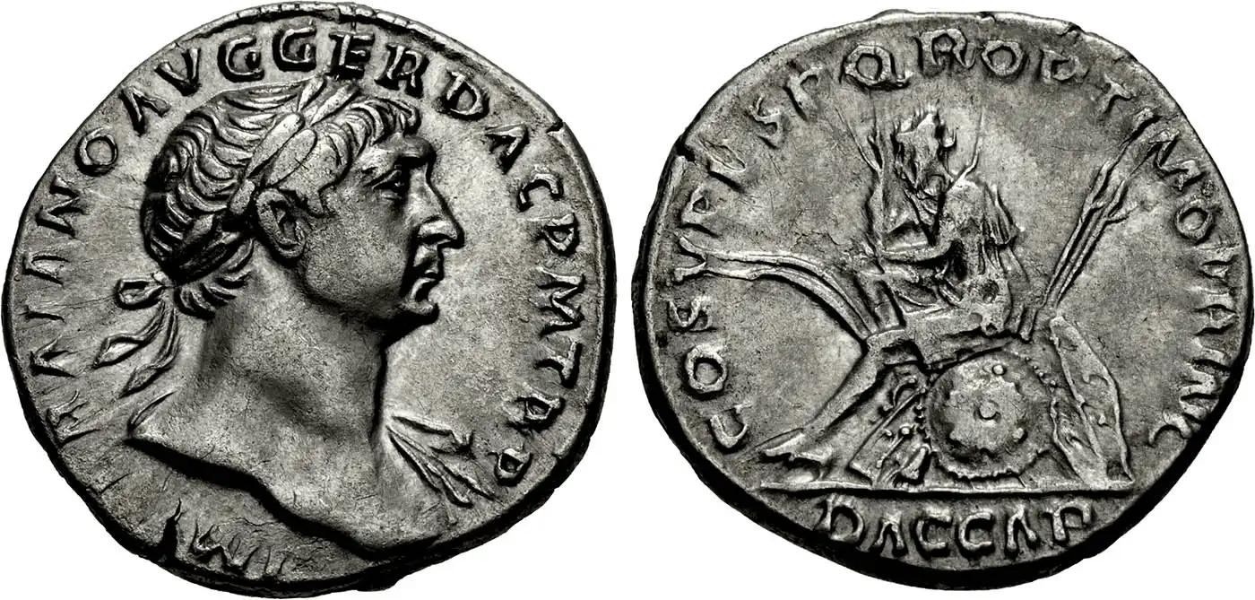 트라야누스 치하에서 로마 제국은 가장 큰 영토에 도달했다. 동방에서의 압박이 과도한 확장으로 바뀌는 동안, 다뉴브 강에 대한 트라야누스의 원정은 로마가 다키아(오늘날의 루마니아)의 새로운 땅과 금광을 모두 얻게 했다. 게다가 다키아 정복(101-102년 및 105-106년)은 제국의 마지막 주요 영토 추가였다. 이 위대한 업적은 유명한 트라야누스 기둥이 세워지면서 로마에서 불후의 명성을 얻었다. 그러나 기념비적인 기둥은 제한된 수의 사람들만이 볼 수 있었다. 그래서 트라야누스는 광대한 제국 전역에 메시지를 퍼뜨리기 위해 검증된 방법인 로마 주화로 눈을 돌렸다.