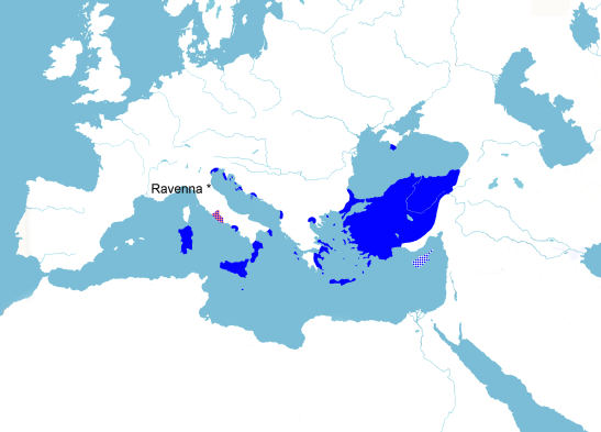 622년부터 628년까지 일련의 눈부신 원정에서 헤라클리우스는 페르시아의 심장부를 황폐화시켰다. 성모 마리아, 제국 해군, 콘스탄티노폴리스 성벽을 믿은 그는, 626년 페르시아와 배신한 아바르족의 수도 포위 공격을 무시했다. 무모함에 가까운 용맹함으로 그는 군대를 이끌고 연전연승했다. 628년 사산 왕조의 귀족들은 호스로를 전복하고 평화 협상을 시작했다. 630년까지 제국의 동방 국경은 완전히 복구되었다. 헤라클리우스가 631년의 개선식 직후 바로 죽지 않고 10년 더 살면서, 그가 막 되찾은 땅의 대부분을 아랍인에게 정복당하는 것을 지켜본 일은 안타까워 보인다. 무함마드의 새로운 신앙으로 연합된 그들은 634년 아라비아에서 출발하여 로마 제국과 페르시아 제국의 지친 군대를 압도했다. 그럼에도 불구하고, 헤라클리우스는 위대한 군인 황제 중 한 명으로 기억되고 있으며, 100년 동안 지속된 왕조의 창시자이자 라틴 서부에서 제위에 오른 마지막 황제였지만, 임페라토르가 아닌 그리스어 칭호 바실레우스를 채택한 최초의 황제이기도 하다. 그의 고향인 카르타고 속주는 아프리카의 마지막 로마 영토였지만 698년에 아랍인에게 함락되었다. 매년 아랍인은 아나톨리아를 깊숙이 공격했고, 674-8년에 콘스탄티노폴리스를 포위했고, 717-8년에 다시 포위했다. 콘스탄티노폴리스의 인구는 50,000명 이하로 떨어졌고 심지어 제대로 작동하는 수도교도 없었다. 한편 이탈리아에서는 랑고바르드족이 제국의 영토를 조금씩 획득하고 있었다. 751년, 그들은 마침내 제국의 본거지인 라벤나를 점령했다. 로마가 다음 차례였고, 콘스탄티노폴리스에서 지원군을 받을 가망은 전혀 없었다. 741년부터 사실상 로마의 통치자였던 교황 자카리아는 프랑크 왕국에 도움을 청하는 이례적인 조치를 취했다. 751년, 교황은 피피누스를 궁재에서 프랑크 왕국의 왕으로 승격시키는 것을 승인했다. 피피누스는 754년 로마 주변 영토에서 랑고바르드족을 몰아냄으로써 호의에 보답했지만, 명목상으로는 제국의 일부로 남았다. 485년 오도아케르의 왕국과 비슷하게, 그 모호한 지위 때문에 옅은 붉은색 바탕에 파란색 점이 찍혀 있다.