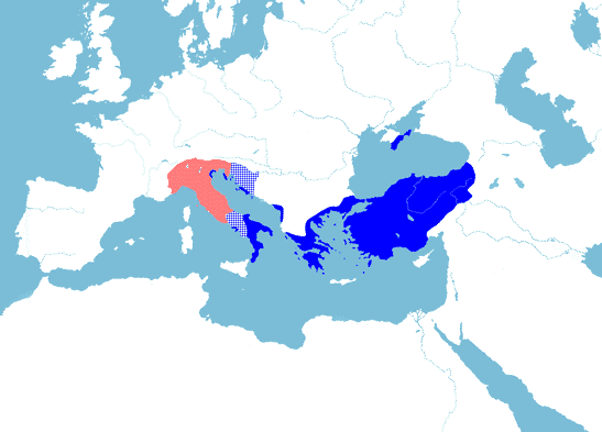 제노는 이탈리아에서 오도아케르의 지위를 결코 받아들이지 않았고, 다뉴브 강의 남쪽 지역을 점령(476-488년)한 동고트족이 488년 이탈리아를 침공하도록 부추기는 데 아무런 거리낌이 없었다. 493년, 동고트 왕 테오도리쿠스는 오도아케르를 대체했고, 다시 황제(당시 아나스타시우스 1세)의 이름으로 통치함을 주장했다. 테오도리쿠스는 자신의 왕국을 강화하고 확장했으며, 이름만 내세우지 않았을 뿐 로마 황제로서 군림했다. 497년, 아나스타시우스는 심지어 오도아케르에게 항복했을 때 입었던 서로마 황제의 예복을 이탈리아에 돌려주기까지 했다. 테오도리쿠스는 526년에 사망하고, 이듬해 제국의 서방을 되찾겠다는 사명을 품은 유스티니아누스 대제가 콘스탄티노폴리스에서 즉위했다. 533년부터 540년까지 그의 장군 벨리사리우스는 반달족으로부터 아프리카를, 동고트족으로부터 이탈리아 대부분을 정복했다. 그러나 벨리사리우스는 소환되었고, 동고트족은 재집결했으며, 이탈리아에서의 파멸적인 전쟁은 질질 끌었다. 563년 동고트족의 저항이 마침내 잦아들었을 때, 로마는 옛 모습의 그림자만 남았다. 유스티니아누스는 이미 로마의 원로원과 집정관직을 완전히 폐지했다. 로마를 점령했지만, 유스티니아누스의 제국은 콘스탄티노폴리스(비잔티움)에서 전적으로 통치되었다. 지도에서 파란색으로 표시되어 있는 곳을 비잔틴 제국이라고 부르는 것은 관례적이고 매우 편리하다. 그러나 이 이름은 로마 제국 자체에서는 사용되지 않았고, 제국은 로마라는 이름을 결코 버리지 않았다. 콘스탄티노폴리스는 이제 전성기의 로마만큼이나 컸으며, 50만 명의 인구를 가진 세계 최대 도시가 되었다. 마지막 이탈리아 원정과 동시에, 유스티니아누스는 친로마 성향의 아타나길두스가 스페인 서고트 왕국의 왕위를 차지하도록 돕기 위해 제국군을 파견했다. 아타나길두스는 성공했고, 그 대가로 제국의 종주권을 인정하며 남부 스페인을 제국에 양도했다. 정복 분야에서 유스티니아누스의 업적은 주목할 만했지만, 그가 법(그의 저작물은 유럽 법률의 기초가 됨)과 건축 분야(소피아 대성당은 거의 천년 동안 세계에서 가장 큰 건축물이었음)에서도 그에 못지않은 위대한 유산을 남겼다는 것을 깨닫게 되면 더욱 놀라워진다. 그리고 이 모든 일은 제국 역사상 최악의 전염병 중 하나인 "유스티니아누스 역병"을 겪던 시기에 일어났다.