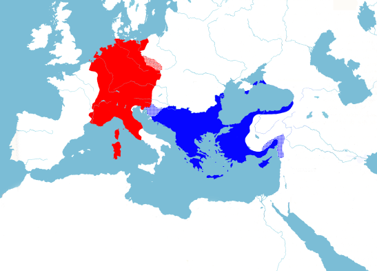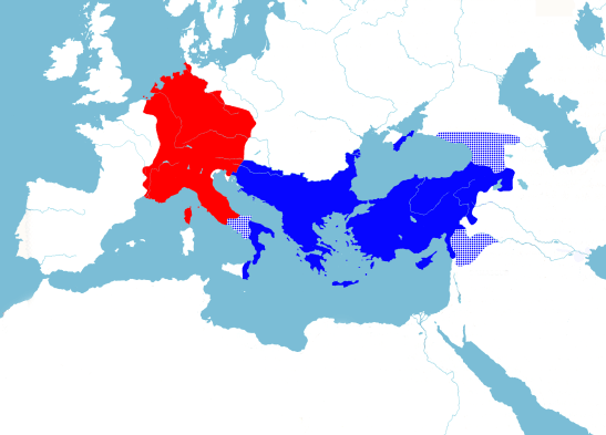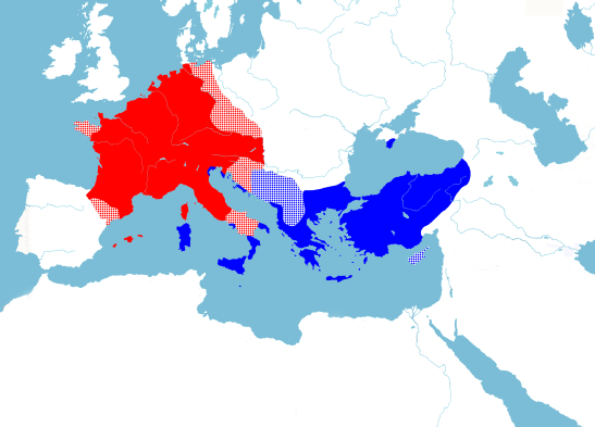마누일 콤니노스의 죽음 이후, 동방 제국은 또 다른 급속한 쇠퇴를 겪었다. 1181년부터 1187년까지 크로아티아가 헝가리에게 넘어갔고 세르비아와 불가리아는 독립을 되찾았다. 십자군은 황제의 종주권을 인정하지 않았고 1190년에는 키프로스를 점령했다. 서방과의 관계는 악화되었고, 내전이 발발했다. 1203년, 제위를 다투던 알렉시오스 4세 앙겔로스는 콘스탄티노폴리스와 제위를 얻는 데 도움을 준다면 제4차 십자군에게 20만 마르크를 지불하겠다고 약속했다. 십자군은 1204년에 그렇게 했지만, 황제가 된 그는 국고가 텅 비어 있음을 알게 되었다. 인내심을 잃은 십자군은 1204년 콘스탄티노폴리스를 약탈하고 그들 중 한 명을 제위에 앉히며, 콘스탄티노폴리스에 라틴 제국이 세워졌다. 십자군과 그들에게 수송 수단을 제공한 베네치아는 콘스탄티노폴리스에서 그리스 남부, 에게 해 제도, 아나톨리아의 북동부 해안까지 해안 전체를 점령하는 데 성공했다. 남은 비잔틴 영토는 서부 아나톨리아의 니케아 제국, 북부 아나톨리아의 트라페준타 제국, 그리고 아드리아 해의 이피로스 전제군주국 등 몰락한 제국의 영토를 놓고 다투는 국가들로 분열되었다. 1261년 니케아 제국의 미하일 8세 팔라이올로고스가 쇠퇴한 라틴 제국으로부터 콘스탄티노폴리스를 탈환하는 데 성공했다. 불가리아와 세르비아의 많은 부분을 수복했지만, 몇몇 십자군 국가들은 남부 그리스에 남아있었다. 1282년 트라페준타 황제는 콘스탄티노폴리스 황제의 지위를 받아들이면서 스스로를 데스포티스(군주, 황제보다 낮은 지위)라고 부르기로 동의했다. 1284년 이피로스 전제군주국과 1288년 테살리아의 세바스토크라토르와 같이 그리스에 남아 있던 독립적인 비잔틴 통치자들 역시 굴복했다. 그러나 한편, 서부 제국은 이탈리아에 대한 지배력을 잃고 있었다. 1183년 초, 이탈리아 북부의 롬바르드 도시들은 자치권을 확립했다. 1282년 합스부르크가 루돌프 황제가 교황령의 1278년 독립 선언을 승인하면서 서부의 로마 제국은 사실상 존재하지 않게 되었다. 엄밀히 말하면, 마지막 교황의 대관식은 1220년에 있었으며, 그는 대관식을 치르지 못했기에 루돌프는 황제가 아닌 로마인의 왕이었다. 교황이 통치하는 로마 교황령은 위 지도에서 옅은 붉은색으로 표시되어 있다.
