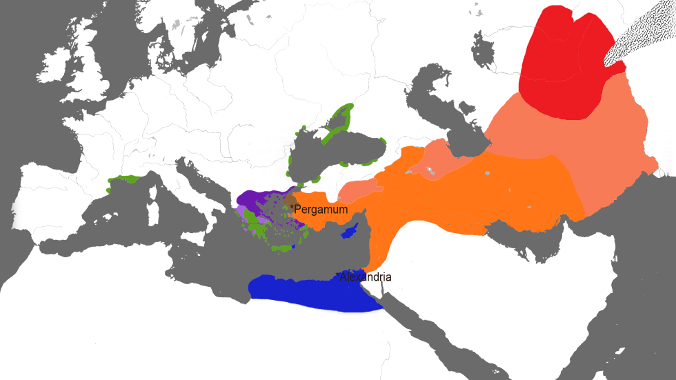 198년, 2개의 로마 군단이 그리스에 상륙하여 마케도니아 팔랑크스의 힘을 영원히 깨뜨렸다. 196년 올림픽에서 그리스 도시들은 마케도니아의 지배로부터 자유로워졌다는 말을 들었지만, 현실은 로마인이 새로운 지배자였다. 192년, 로마는 안티오코스 3세와 전쟁을 벌여 그를 쫓아냈다. 188년의 평화 조약으로 셀레우코스 왕조는 아나톨리아 영토의 대부분을 잃었고, 주요 수혜자는 로마의 동맹인 페르가몬이었다. 이후 파르티아의 세력이 커지면서 메소포타미아 동쪽의 셀레우코스 왕조의 지위는 무너지기 시작했다. 추가적인 전쟁이 있은 후, 로마는 148년과 146년에 마케도니아와 그리스를 완전히 합병했다. 피할 수 없는 일에 굴복한 아탈로스 왕조의 마지막 왕은 133년 그가 죽으면서 페르가몬을 로마에 물려주었다. 이 시기에 셀레우코스 왕조의 영토는 시리아와 팔레스타인에 국한되었고, 64년 폼페이우스가 이 지역을 로마에 합병했을 때 그 영토는 몇 개의 도시로 축소되었다. 알렉산드로스의 계승자들 가운데 오랫동안 로마의 보호를 받고 있던 이집트의 프톨레마이오스만이 남게 되었다(*). 프톨레마이오스 왕조의 마지막 통치자인 클레오파트라 7세는 두 명의 로마인 지도자와의 친밀한 관계를 통해 왕국의 독립을 유지했다. 첫 번째는 48년에 그녀를 왕위에 앉힌 율리우스 카이사르였다. 그에게서 아들 카이사리온을 낳고, 아들을 공동 통치자로 임명했다. 두 번째는 44년 카이사르가 사망한 이후 로마 제국의 동부를 통치한 마르쿠스 안토니우스였다(서부는 옥타비아누스가 통치). 그녀는 안토니우스와의 사이에서 세 아이를 낳았고, 37년에 그와 결혼했다. 안토니우스는 34년의 "알렉산드리아 기증"에서 클레오파트라와 카이사리온에게는 키프로스가 이집트 왕국으로 회복되었고, 그의 아들 알렉산드로스 헬리오스에게는 아르메니아(및 명목상 안토니우스가 정복할 계획이었던 메디아와 파르티아)를, 그의 딸 클레오파트라 셀레네에게는 키레나이카(및 명목상 옥타비아누스가 통제하는 리비아)를, 그의 어린 아들 프톨레마이오스 필라델포스에게는 페니키아, 시리아 및 킬리키아를 나눠주면서 로마가 동방에서 지난 40년 동안 획득한 영토에서 그의 그리스 가족을 위한 왕국을 세웠다. 이 영토들은 위의 지도에서 옅은 파란색으로 표시되어 있고, 안토니우스의 로마 영토는 훨씬 더 옅은 파란색으로 표시되어 있다.