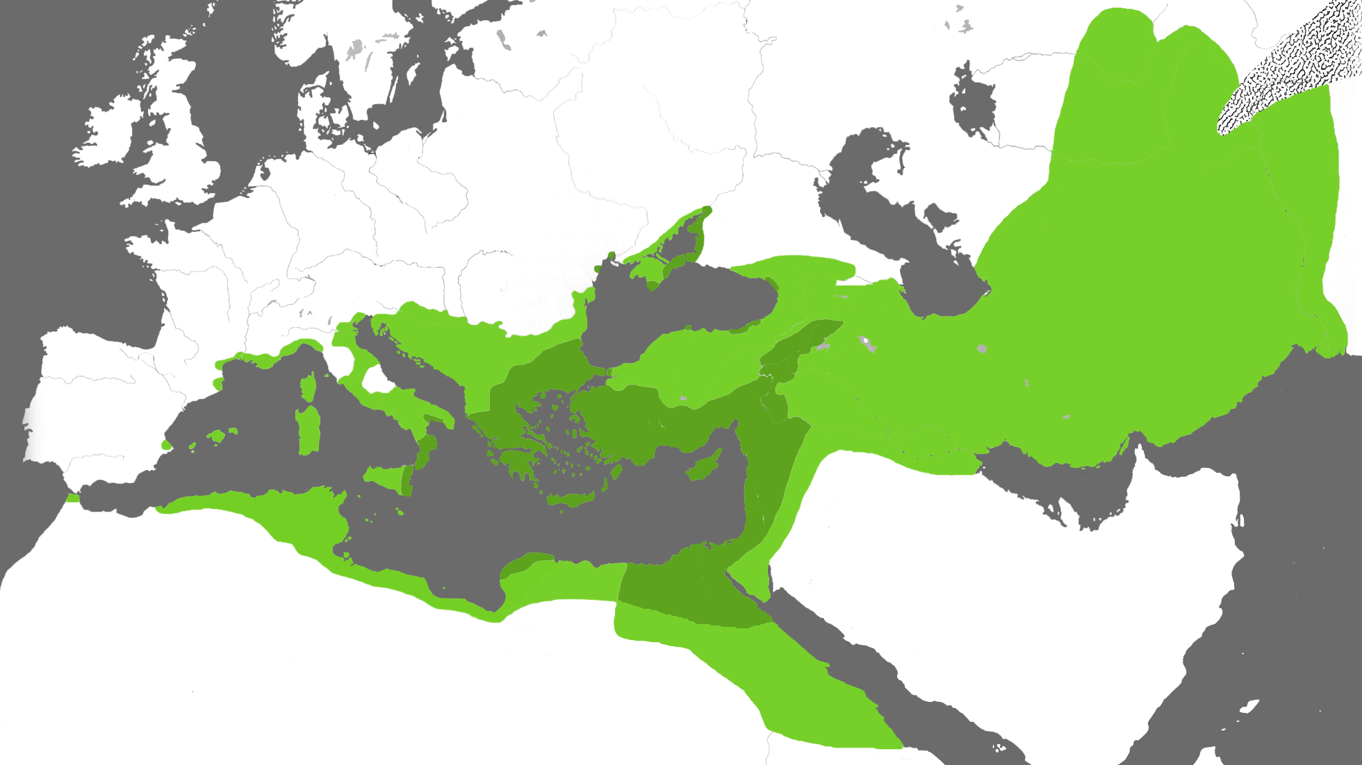 이 지도는 BC 336년부터 현재까지의 이전 10개 지도에서 묘사된 그리스 문명을 요약한 것으로, BC 34년 지도에서 매우 옅은 색조로 표시된 영역(안토니우스가 지배한 로마 지역), 285년 지도에서 나타난 영역(디오클레티아누스가 지배한 지역)은 포함하지 않는다. 짙은 녹색으로 표시된 부분은 위 지도에서 적어도 절반(즉, 5개)에 나타나며, 옅은 색상은 절반 밑으로 계산된다. "핵심" 그리스 지역인 짙은 녹색 지역은 그리스 본토, 마케도니아, 트라키아, 아나톨리아 서부, 킬리키아, 시리아(페니키아와 팔레스타인을 포함), 하이집트와 아르메니아를 포함한 연속적인 영토로 구성되어 있다. 에게해 제도와 키프로스 섬, 키레나이카, 마그나 그라이키아, 흑해 연안의 일부도 포함된다. 옅은 녹색 지역은 주로 비잔틴 제국의 유럽 및 아프리카 영토 때문에 알렉산드로스 제국보다 상당히 큰, 인도에서 모로코까지 뻗어 있다.