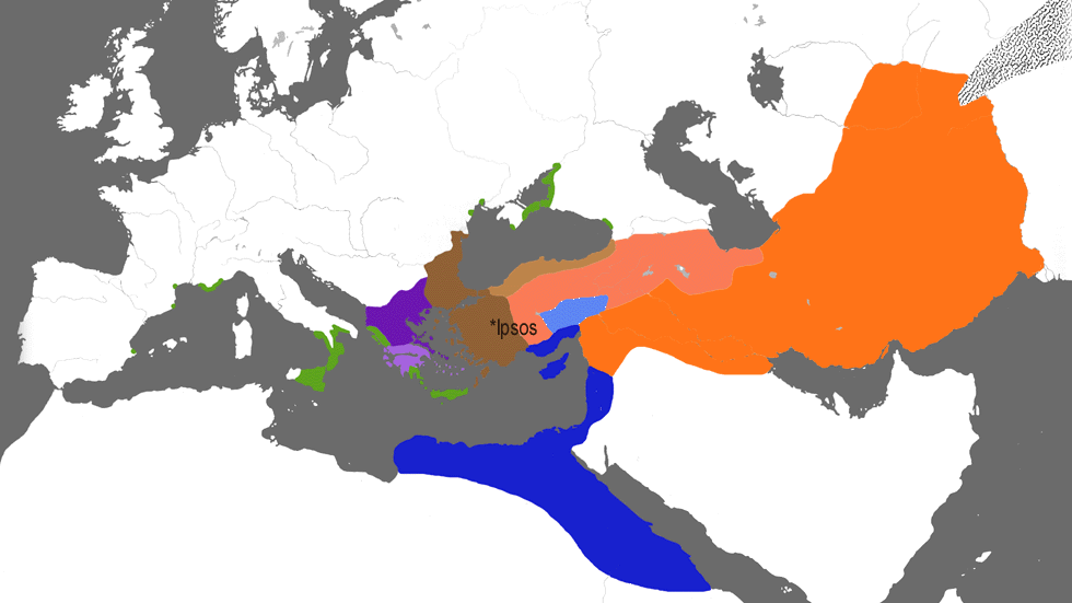 알렉산드로스가 죽자, 제국은 지체 부자유한 이복동생 필리포스와, 아직 배 속에 있던 그의 유일한 아들(또한 알렉산드로스라고 불리는)에게 넘어갔다. 놀랄 것도 없이, 그의 장군들은 이러한 무능한 상속자들에게 충성심을 유지하기보다는 제국의 여러 지역에 대한 그들의 지배권을 확고히 하기 시작했다. 이 장군들은 후계자인 디아도코이로 알려지게 되었고, 곧 그들끼리 싸우기 시작했다. 필리포스는 317년에 암살당했고, 어린 알렉산드로스는 306년에 그가 성년이 되었을 때 암살당했다. 그 후 디아도코이는 그들 스스로를 왕(바실레이오이, 단수 바실레우스)으로 치장하기 시작했다. 후계자 중 한 명인 안티고노스는 여전히 제국의 재통합을 꿈꿨지만, 다른 디아도코이는 301년 입소스 전투에서 그를 물리치기 위해 힘을 합쳤다. 그 후, 위 지도에서 다른 색으로 표시된 4개 계승 왕국의 조금 더 안정된 정치적 상황이 나타났으며, 그들의 영향 지역은 더 옅은 색조로 표시되어 있다. 마케도니아 왕국(이전과 같이 로열 바이올렛색)은 필리포스의 딸과 결혼한 카산드로스가 다스렸다. 트라키아와 서부 아나톨리아는 리시마코스 왕국(갈색)을 형성했다. 프톨레마이오스는 이집트(파란색)를 지배했고, 그의 통치를 팔레스타인과 킬리키아까지 확장했다. 네 번째이자 가장 큰 계승국은 시리아에서 인더스까지 통치한 셀레우코스(오렌지색)였다. 알렉산드로스의 인더스 너머 정복지는 셀레우코스가 인도의 마우리아 제국에 넘기고, 500마리의 전쟁 코끼리와 맞바꾸어 입소스 전투에서 그 가치를 증명했다. 이 손실과 중앙아시아에서 알렉산드리아 에스카티(가장 먼 알렉산드리아)의 손실을 제외하더라도, 디아도코이 왕국들을 합치면 알렉산드로스 제국 이상으로 확장되었다(종속 지역이 포함된 경우에만).