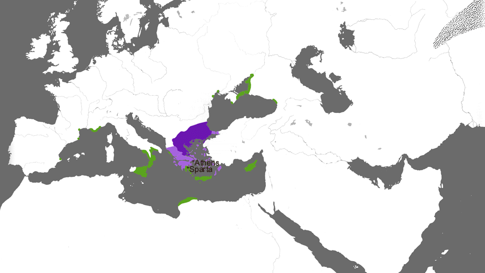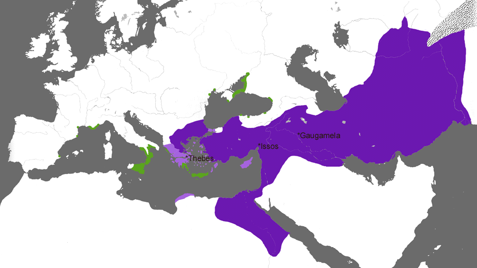 서구 문화를 정의하는 철학, 예술, 문학을 낳은 시대인 그리스의 영광은 BC 480-79년에 광대한 페르시아 제국의 침략군에 맞서 아테나이와 스파르타가 이끄는 그리스 도시 국가들이 승리한 덕분이다. 그러나 이 압도적인 승리에도 불구하고, 그리스의 대반격은 없었고, 페르시아는 386년에 이오나(아나톨리아의 서해안)까지 되찾았다. 대신, 고전 시대의 그리스인들은 페르시아군에 용병으로 입대하거나 도시 간 전쟁(주로 아테나이, 스파르타, 테바이가 관련된)을 벌이며 군사적으로 바빴다. 이러한 (돌아보면) 사소한 투쟁은 그리스 본토의 북방에 있는 헬레니즘화 된 마케도니아 왕국의 필리포스에 의해 종결되었다. 그의 군대의 강점은 (i) 마케도니아 팔랑크스, 여러 대열로 구성되어 있으며 각 대열은 5 m 이상의 장창으로 무장하고 있었다, (ii) 테살리아 기병대의 두 가지였다. 338년에 이 군대는 아테나이와 테바이의 연합 호플리테스 군대를 격파했는데, 결정적인 움직임은 필리포스의 10대 아들 알렉산드로스가 이끄는 기병대가 테바이의 측면을 선회하여 공격한 기병 돌격이었다. 이 승리로 스파르타를 제외한 그리스 전체가 필리포스의 지배하에 놓이게 되었다. 위의 지도에서 마케도니아 왕국은 로열 바이올렛으로, 필리포스에게 충성을 맹세한 국가는 밝은 색조로, 독립 그리스 국가(스페인에서 콜키스까지의 식민지와 스파르타)는 녹색으로 표시되어 있다. 이러한 정복에 만족하지 못한 필리포스는 페르시아를 상대로 그리스군을 이끌고 페르시아의 침략에 대한 복수를 하겠다는 계획을 발표했다. 336년 떠나기 전날에 그는 암살당했고, 20세의 알렉산드로스가 마케도니아 왕위에 올랐다.