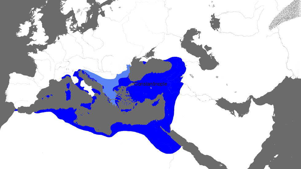 디오클레티아누스의 통치 체계는 305년 그의 자발적인 은퇴 후에 오래 지속되지 못했고, 324년 로마 제국은 다시 한 명의 황제 콘스탄티누스가 있게 되었다. 그는 두 가지 중대한 결정으로 대제로 일컬어진다. 먼저, 그는 제국의 동부에 적절한 수도가 필요하다는 것을 인식하고, 구 비잔티움 부지에 새로운 로마(곧 콘스탄티노폴리스로 알려짐)를 건설했다. 둘째, 그는 기독교를 받아들였다. 395년까지 이러한 결정들은 제국의 본질을 완전히 바꾸어 놓았다. 기독교는 국교가 되었고, 제국은 각각 황제와 궁정, 원로원을 가진 동부와 서부로 영구히 나뉘었다. 다음 세기에 걸쳐 서부 제국은 게르만 침략자들에게 무너졌고, 동부 제국은 온전하게 살아남았다. 533년부터 563년까지 서방의 상당 부분을 동방에서 재정복 했지만, 이제 콘스탄티노폴리스 한 곳에 황제, 궁정, 원로원이 있을 뿐이었다. 이러한 이득의 절반은 629년까지 상실했고, 슬라브족의 정착으로 발칸반도 대부분에 대한 직접적인 지배권을 잃었음에도 불구하고, 제국은 다시 한번 그리스인이 지배하는 곳으로 남겨졌다. 헤라클리우스 황제는 이러한 현실을 인식하고 그리스어를 제국의 공식 언어로 채택하여 바실레우스 이라클리오스(*)가 되었다. 명목상으로는 여전히 로마 제국의 황제였던 헤라클리우스는 사실 클레오파트라 이후 최초의 그리스 바실레우스였으며, 위 지도의 색상은 그것을 반영하고 있다. 이 지도의 시점 당시, 헤라클리우스는 602년에 침공한 페르시아 제국으로부터 최동단 속주(BC 34년 클레오파트라와 그 자녀들의 왕국과 거의 일치함)를 최근에 탈환했다.