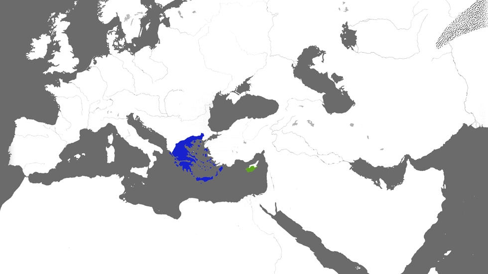 모레아는 1458-60년, 트레비존드는 1461년, 테오도로는 1475년 오스만에 정복되었다. 그 이후 헬라스(그리스) 공화국이 오스만 제국으로부터 독립 전쟁(1821-27년)을 승리로 장식할 때까지 350년 동안 그리스 국가는 없었다. 1832년 열강은 바이에른 군주를 왕으로 추대했고, 콘스탄티노스 11세가 권고받은 것처럼 자신을 헬레네스의 바실레우스라고 칭했다. 이 왕국은 모레아와 중앙 그리스로 구성되어 있었고, 그리스어 화자의 대다수는 국경 밖에 있었다. 이 시기에 많은 그리스 민족주의자들은 모든 그리스어 화자를 재통합하는 메가리 이데아(위대한 이념)를 믿었다. 아나톨리아의 일부, 특히 트레비존드 주변에는 여전히 그리스인이 다수였고, 콘스탄티노폴리스에는 상당한 소수가 있었기 때문에, 메가리 이데아는 사실상 비잔틴 제국의 회복을 의미했다. 19세기 후반과 20세기 초의 전쟁에서 그리스는 이 목표에 근접했지만, 1920-23년의 전쟁에서 새로운 터키 공화국에 패배함으로써 그리스인은 위에 표시된 파란색 지역(1945년 이탈리아가 양도한 로도스도 포함)에 만족해야 했다. 중세의 중심지인 콘스탄티노폴리스가 아닌 고전 그리스의 중심지인 아테네가 현대 그리스의 수도가 되었다. 그러나 키프로스에서의 사건들은 1970년대에도 메가리 이데아가 여전히 일부 그리스인을 지배하고 있음을 보여주었다. 80%가 그리스어를 사용하는 이 섬은 1190년 십자군에게 빼앗겼고, 1571년 오스만 제국에 정복당했으며, 1914년 영국에 합병되었고, 1960년에 독립했다. 그리스 군부 통치자들(1967-74년)이 상당한 소수 터키인의 희망에 반하여 키프로스를 그리스와 통합하려는 정치적 압력은 1974년 터키의 섬 침공을 이끌었다. 이로써 키프로스 북부의 3분의 1에 사실상의 터키 국가가 수립되었고, 키프로스 남부의 3분의 2만이 국제적으로 인정받는 키프로스 정부 아래에 남게 되었다. 이 국가는 거의 전적으로 그리스인이며, 위에서 녹색으로 표시되어 있다. 마지막으로 트라키아를 더하고 스파르타와 크레타를 빼면 현대 그리스는 필리포스의 마케도니아 제국과 거의 근접할 것이라는 점이 눈길을 끈다.