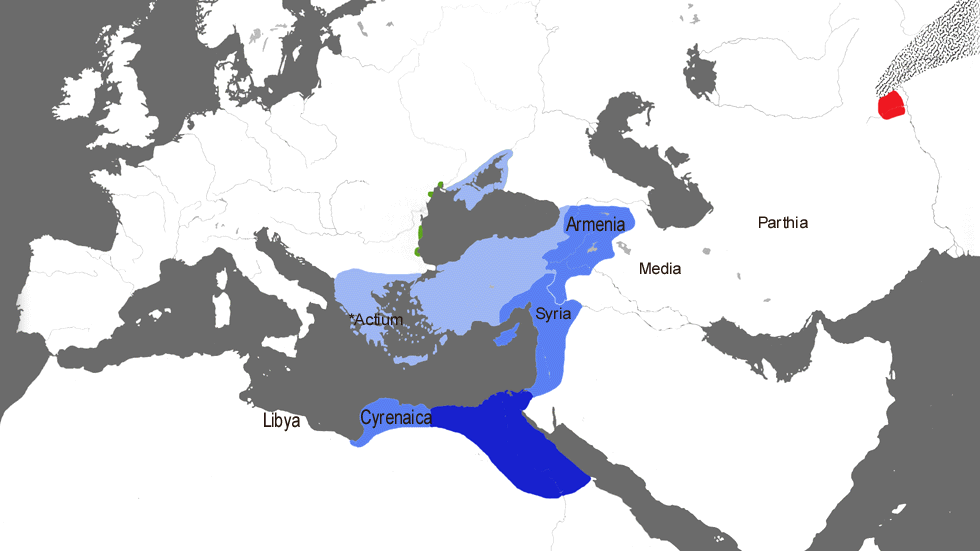 이집트의 부와 그의 베테랑 군단의 힘을 배경으로 한 안토니우스의 메디아와 파르티아 정복 야망은 단순한 꿈이 아니었다. 만약 그가 성공했다면 그와 클레오파트라는 알렉산드로스 대왕의 제국을 거의 모두 재통합했을 것이다. 하지만 운명은 다른 계획이 있었다. BC 32년, 옥타비아누스는 로마 원로원을 설득하여 안토니우스의 직위를 박탈하고 클레오파트라와의 전쟁을 선포했다. 원로원의 3분의 1과 집정관 둘 다 안토니우스와 클레오파트라가 군대를 집결시킨 그리스로 도망쳤다. 그러나 안토니우스는 클레오파트라와 협력하면서 그의 군단병들을 소외했고, 그들은 떼를 지어 옥타비아누스에게 귀순했다. BC 31년 악티움 해전(이전 지도 참조)에서 패배한 클레오파트라는 해군을 이끌고 이집트로 도망쳤고, 안토니우스도 뒤를 따랐다. 옥타비아누스는 이듬해 이집트를 침공했고, 연인들은 자살했다. 옥타비아누스는 이집트를 합병하고 BC 27년에 로마로 돌아와서 아우구스투스 칭호를 부여받아 최초의 로마 황제가 되었다. 사실상 모든 그리스 국가는 이제 로마의 속주 또는 로마의 종속국이었다. 다음 몇 세기 동안, (화장보다) 매장과 같은 그리스 문화와 관습이 제국 전역에 퍼졌다. 동방에서 그리스어는 제국 총독, 법정 또는 군대와의 거래를 제외하고는 링구아 프랑카로 남아 있었다. 284년, 디오클레티아누스가 그리스 가문 출신으로는 처음으로 황제가 되었다. 이듬해 그는 옥타비아누스와 안토니우스가 통치했던 것처럼 제국을 위해 두 명의 통치자를 두는 발상을 되살렸다. 그는 밀라노에서 통치하는 막시미아누스를 서방에 세운 반면 니코메디아에서 동방을 통치했다. 디오클레티아누스의 데미 제국은 3세기에 그리스 출신의 통치자와 그리스 도시에 궁정이 있으며 그리스어를 링구아 프랑카로 삼은 최초의 주요 국가로, 위에 옅은 파란색으로 표시되어 있다.