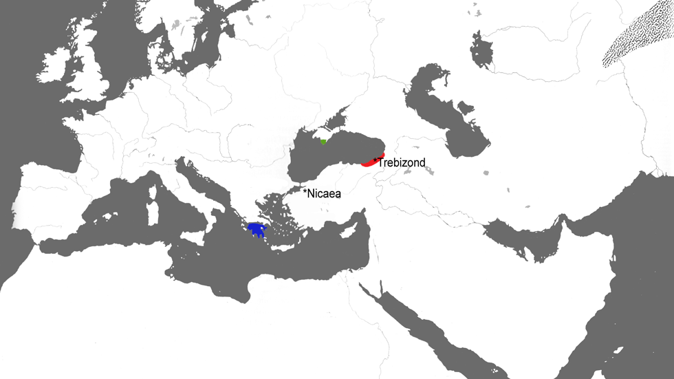 1040년의 비잔틴 제국은 알렉산드로스와 디아도코이 제국의 전체 존재보다 한 세기가 더 긴 4세기 이상 통치기가 남아 있었다. 그러나 이 기간의 대부분 동안 제국은 두 번의 큰 타격으로 인해 이전 모습의 그늘이었다. 첫 번째는 1071년 만지케르트 전투(이전 지도에 표시됨)에서 셀주크 튀르크에 패한 것으로, 이후 아나톨리아 전역이 튀르크에 점령되었다. 서부와 해안 지역은 12세기에 서유럽에서 온 십자군의 도움으로 회복되었지만, 이 카톨릭 군대는 항상 그들의 정교회 형제를 의심했다. 두 번째는 1204년의 십자군이 황제가 제위에 앉는 것을 도운 후, 그에게 대항하여 일어나 콘스탄티노폴리스를 약탈했을 때였다. 십자군은 에게해 주변의 제국 중심부를 장악했고, 비잔틴 제국의 뒤를 잇는 세 개의 주요 계승국인 아나톨리아 서부의 니케아 제국, 아나톨리아 북부의 트레비존드 제국, 아드리아 해의 에페이로스 전제 공국이 주변부에 나타났다. 제국을 재건하기 위한 투쟁은 1261년 콘스탄티노폴리스를 되찾은 니케아에 의해 승리했고, 최종적으로 1340년에 에페이로스를 흡수했다. 트레비존드는 독립을 유지했지만, 그 황제들은 일반적으로 콘스탄티노폴리스에서 "로마 황제"의 우월한 지위를 인정했다. 콘스탄티노폴리스의 마지막 황제 콘스탄티노스 11세(1449-1453년)는 오스만 튀르크에게 도시가 함락되는 동안 사망했다. 오스만 제국은 제국이 보유하고 있던 몇 안 되는 에게해 제도를 소탕하고 1458년에는 콘스탄티노스의 형제 토마스, 디미트리오스가 통치하던 모레아 전제 공국만 남겨두었다. 이 시기에, 모레아는 지성 활동의 온상이었으며, 플라톤의 철학을 홍보하고 심지어 고대 그리스 판테온 숭배로 되돌아가기까지 했다! 트레비존드(붉은색)는 여전히 다비드 "황제" 통치 하에 있었고, 크림 반도(녹색)에는 고티아(Gothia)라고 알려진 혼합 민족 구성을 가진 독립적인 테오도로 공국이 있었지만, 그리스 군주들이 통치했다.