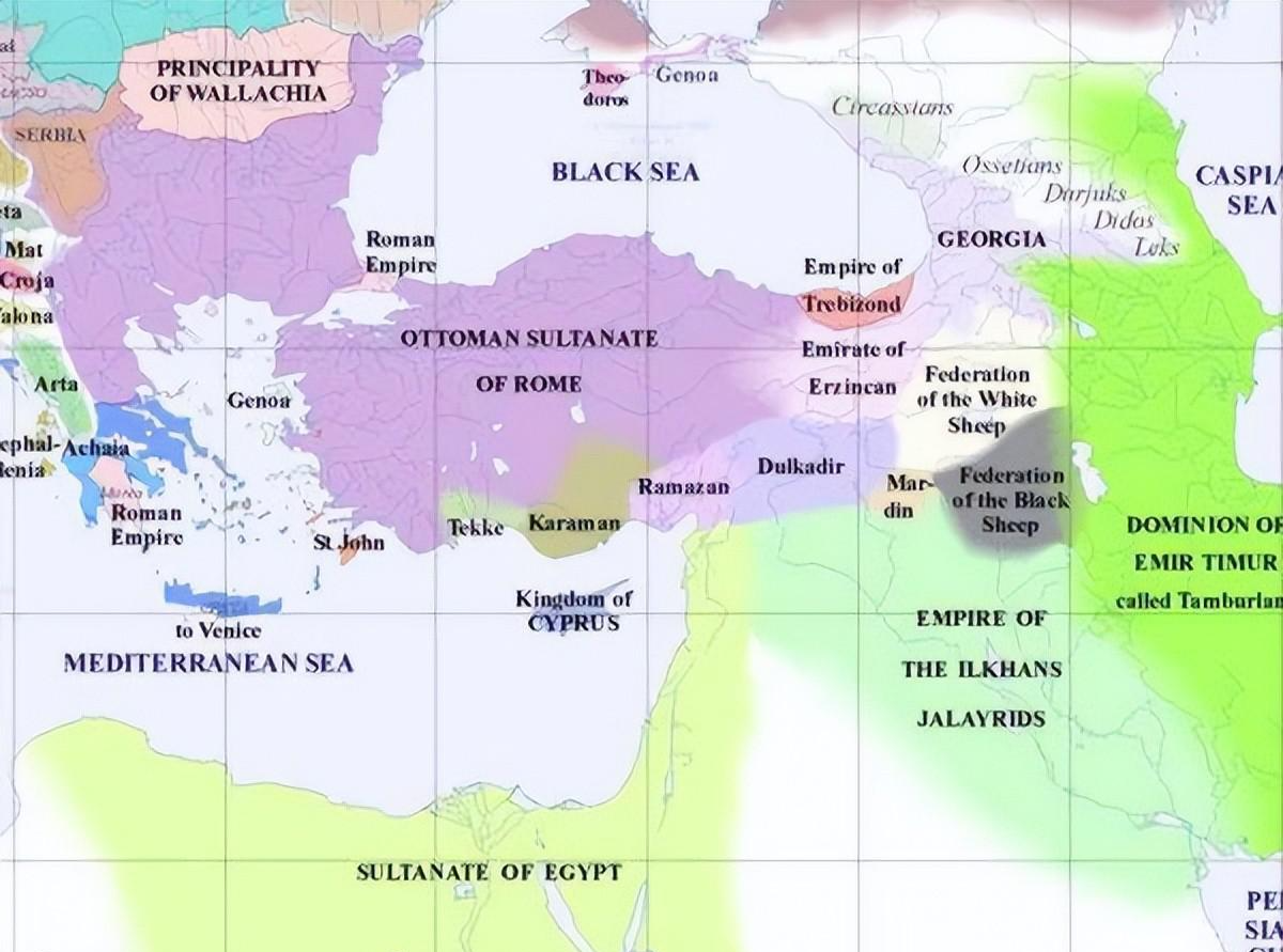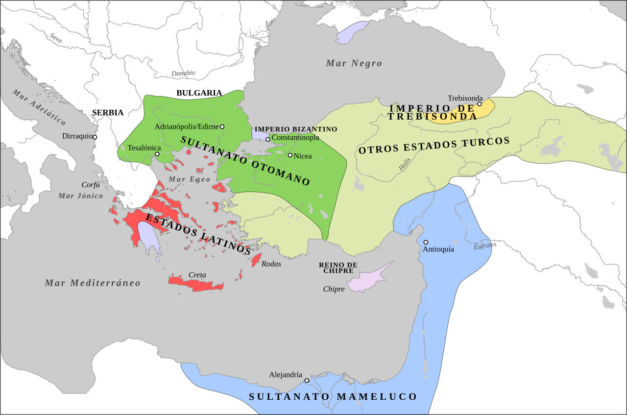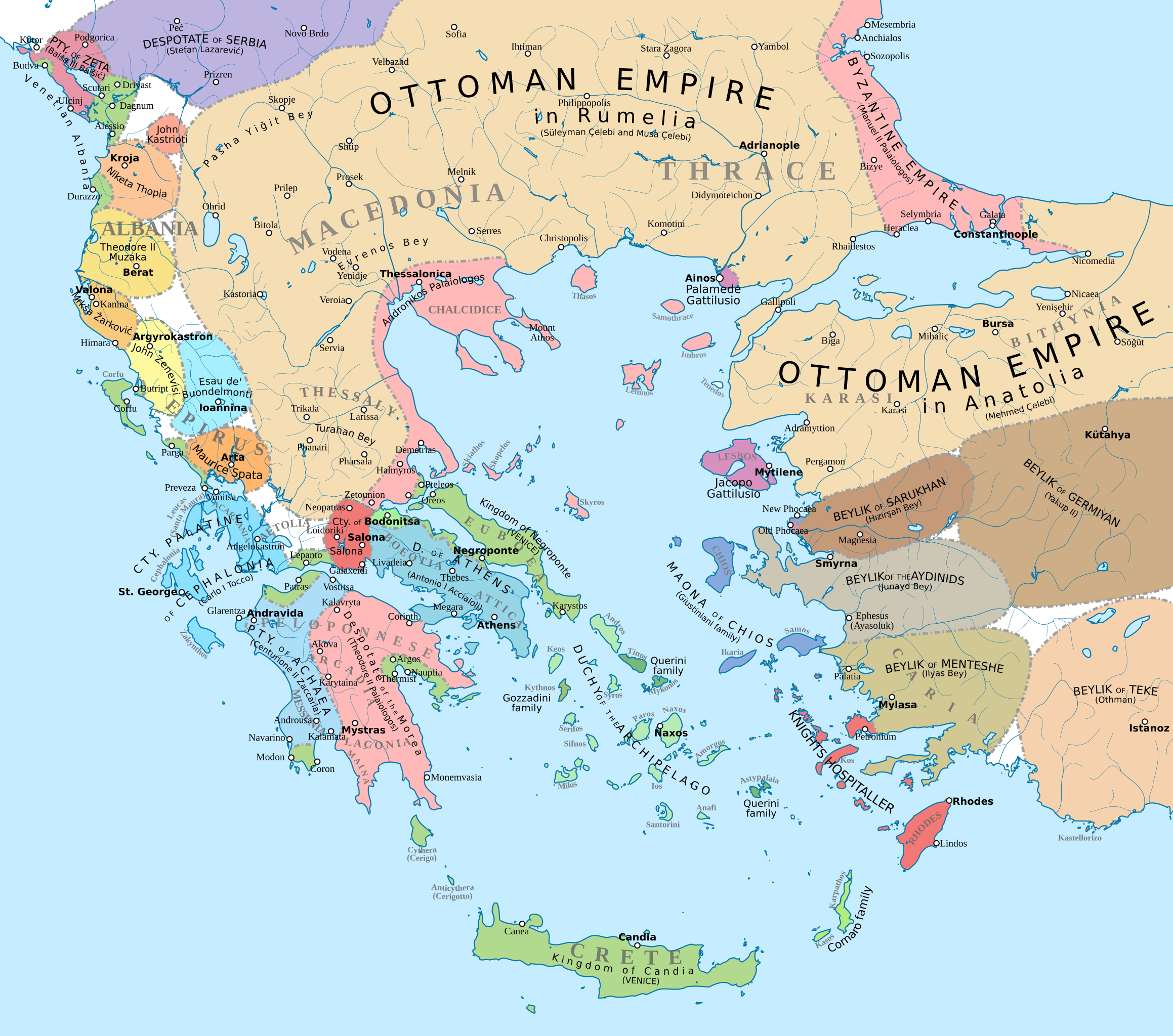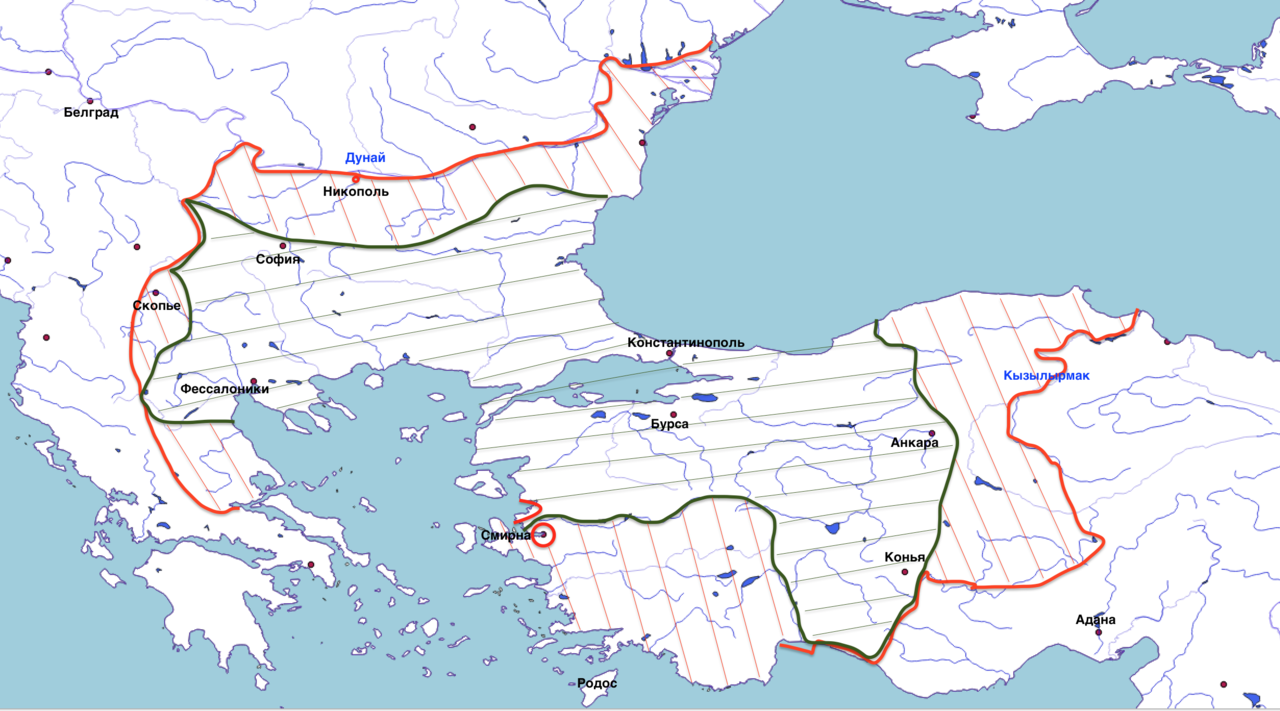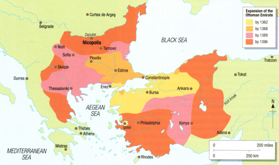 1396년까지 오스만의 확장. 모레아의 끊임없는 다툼은 바예지드의 개입을 필요로 했다. 그는 1394년 세레스에서 발칸의 모든 봉신을 소집하여 이 문제를 해결했으며 그 봉신 중에는 비잔틴 황제 마누일 2세 팔라이올로고스와 세르비아 군주 라자레비치(라자르의 아들)가 있었다. 발칸의 소유권이 술탄에게 있음을 확인했지만 세레스 협정은 깨졌고 화가 난 오스만 통치자는 콘스탄티노폴리스를 봉쇄하고 테살리아를 병합했으며 1395년 모레아에 대한 대규모 토벌을 벌였지만 왈라키아에서 일어난 사건 덕분에 그들은 화를 면했다.