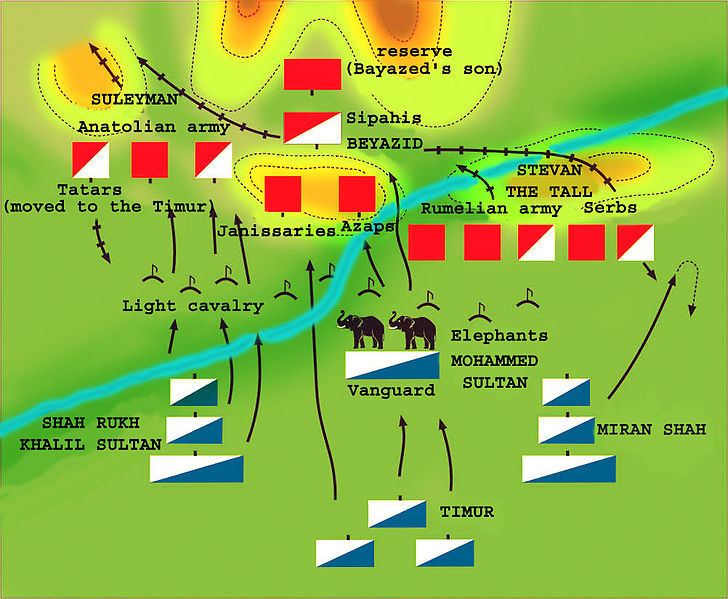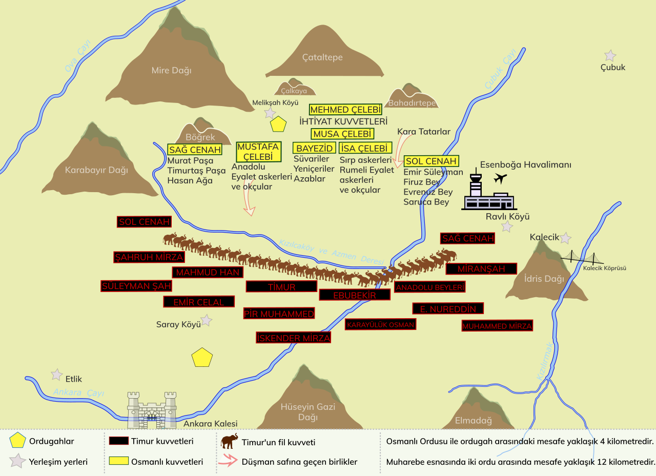 앙카라 전투 초기 배치도. 오스만군이 도착했을 때 그들은 피곤과 갈증을 느꼈지만, 쉬거나 회복할 시간이 허락되지 않았다. 그의 장군들이 산지로 물러나 여름 동안 수세를 취하면서 적을 끌어들이라는 조언을 했지만 바예지드는 공세를 위해 동쪽으로 진군했다. 한편, 티무르군은 몰래 남서쪽으로 이동하여 휴식을 취했고 튀르크군의 후방에 위치해 있었다. 티무르군은 버려진 천막과 수원을 이용하여 오스만군이 차지했던 곳과 같은 장소에 진을 쳤다. 많은 기병과 32마리의 전투 코끼리를 포함하여 총 14만 명에 이르는 티무르군은 티무르가 중군을, 아들 미란과 루흐는 각각 우익과 좌익을, 손자들이 선봉을 맡았다. 8만 5천-12만 명의 오스만군은 바예지드가 예니체리와 중군을, 아들 쉴레이만이 최정예 병력으로 우익을, 스테판 라자레비치는 좌익을, 아들 메흐메트는 후위를 맡았다.