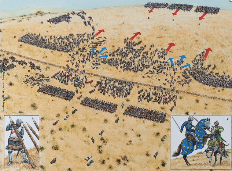 프랑스군이 돌격하여 튀르크 전열의 징집병을 격파하고 보병대로 진격했지만 궁수들의 화살과 날카로운 말뚝에 의해 방해를 받았다. 말의 배에 말뚝이 박히자 기사들은 내렸고, 말들이 지나갈 수 있도록 말뚝을 끌어올리는 행동을 취했다. 그들에게 대열을 정비하기 위해 잠시 멈춰서 휴식을 취하고 헝가리군의 지원을 기다리도록 권고했지만 혈기 넘치는 기사들은 적의 격파와 추격을 고집했다. 기록에 따르면, 절반의 프랑스군이 말뚝에 의해 말에서 내렸다고 한다. 걸어서 언덕에 도달한 그들은 시파히(튀르크 기사) 부대를 마주하게 되었다. 자신들의 처지를 깨달은 프랑스 기사들은 비탈을 따라 도망쳤다. 결국 부르고뉴의 장이 포로가 되자 나머지 프랑스군도 항복했다.