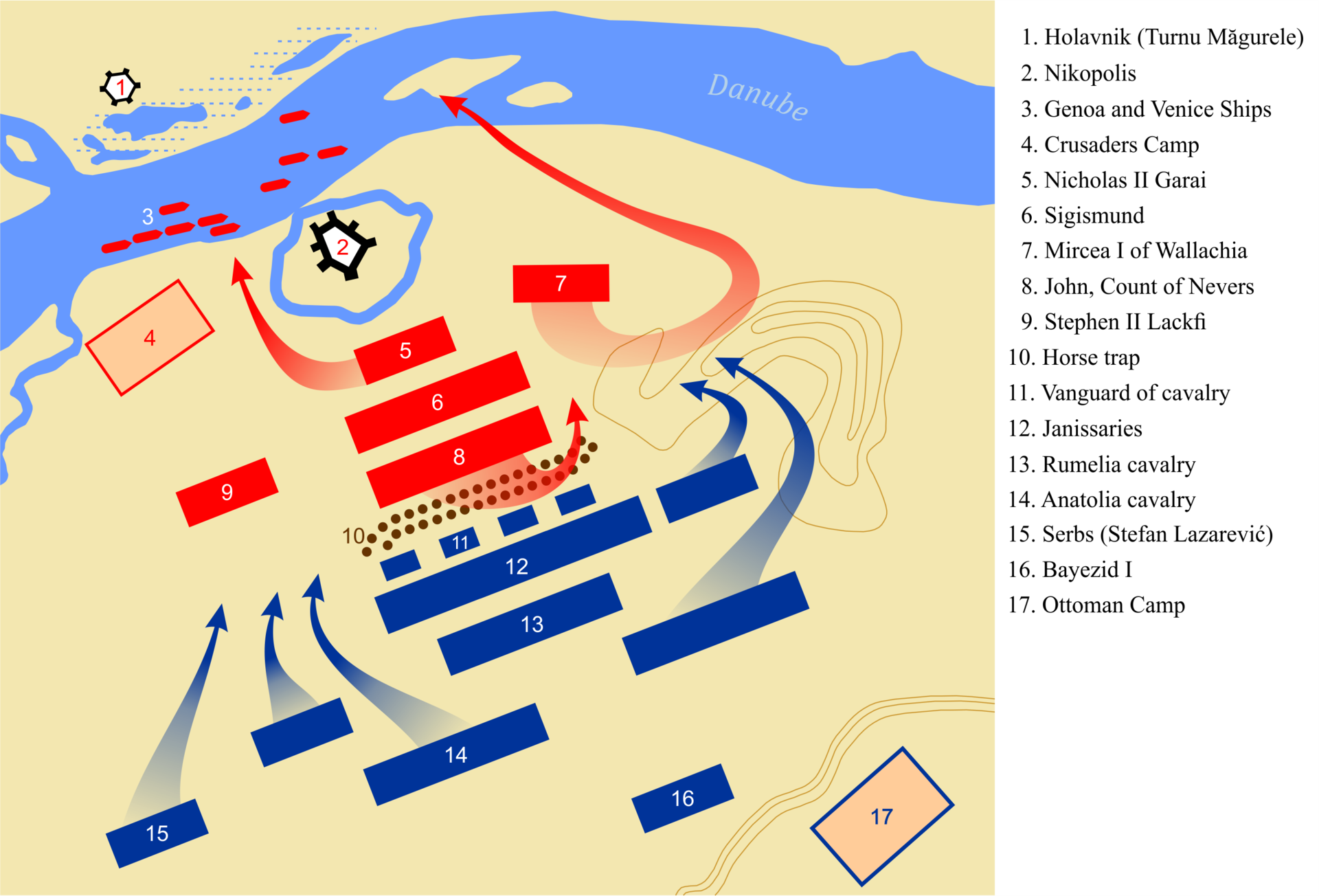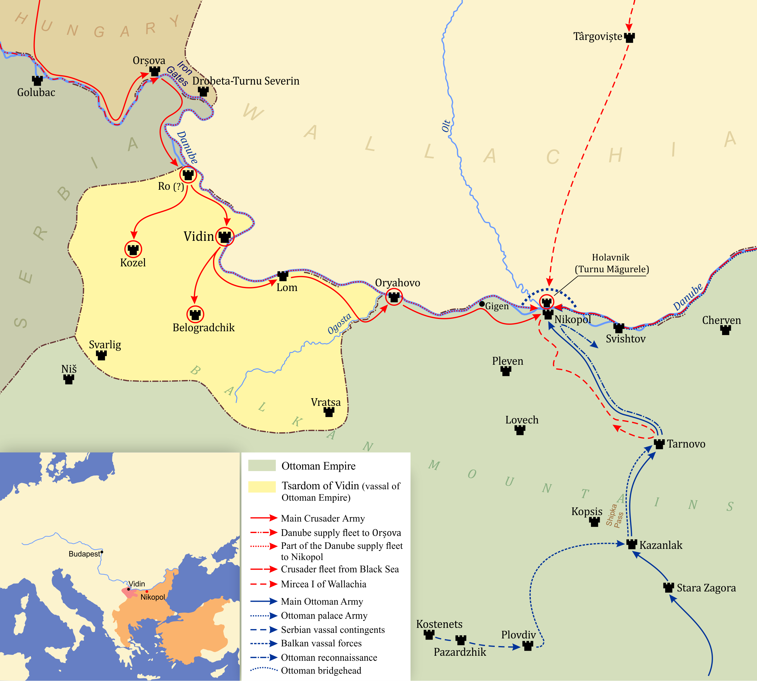 오늘날 유럽 지도에 표시된 다뉴브 강. 1396년 헝가리의 왕 지기스문트는 마침내 오스만에 대항하는 십자군을 조직했다. 그들의 목적은 발칸반도에서 오스만을 몰아내고 콘스탄티노폴리스를 경유하여 해협을 건너 소아시아와 시리아를 거쳐 팔레스타인과 성지를 해방한 뒤 바다를 통해 유럽으로 돌아오는 것이었다. 주로 헝가리 기사와 프랑스 기사로 구성되었지만 왈라키아군도 일부 포함되어 있었다. 또한 마르마라 해에서 튀르크를 봉쇄할 베네치아 함대와 다뉴브 강을 항해하여 왈라키아에서 십자군과 만날 베네치아 함대가 마련되었다. 명목상 지기스문트가 이끌었지만, 지휘관들의 결속력이 약했다.