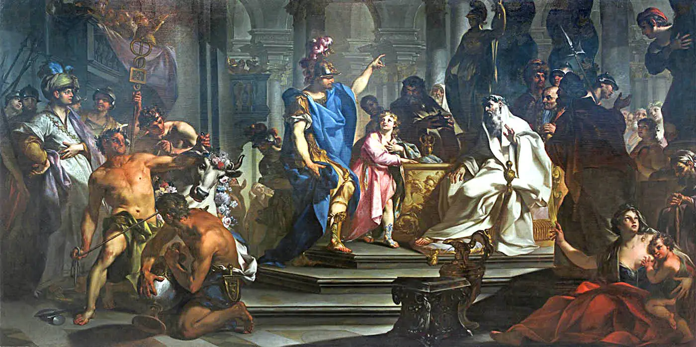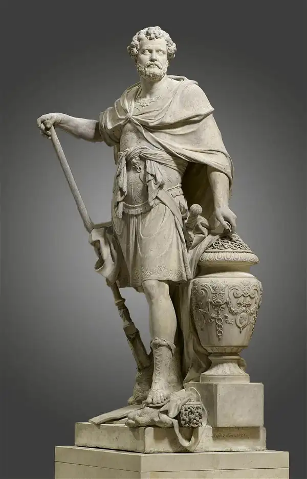 칸나이에서 살해된 로마 귀족들의 반지를 세는 한니발 바르카의 모습을 담은 조각상, 1704년 세바스티안 슬로츠