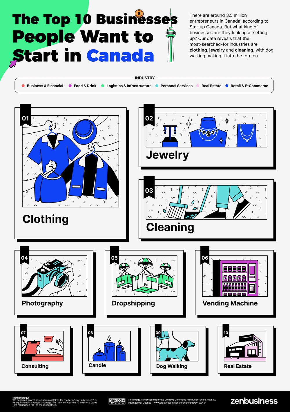 스타트업 캐나다에 따르면 캐나다에는 약 350만 명의 사업가가 있다. 하지만 그들은 어떤 종류의 사업을 설립하려고 하는가? 데이터는 가장 많이 검색되는 산업이 의류, 보석 및 청소이며, 반려견 산책이 상위 10위 안에 든다는 것을 보여준다.