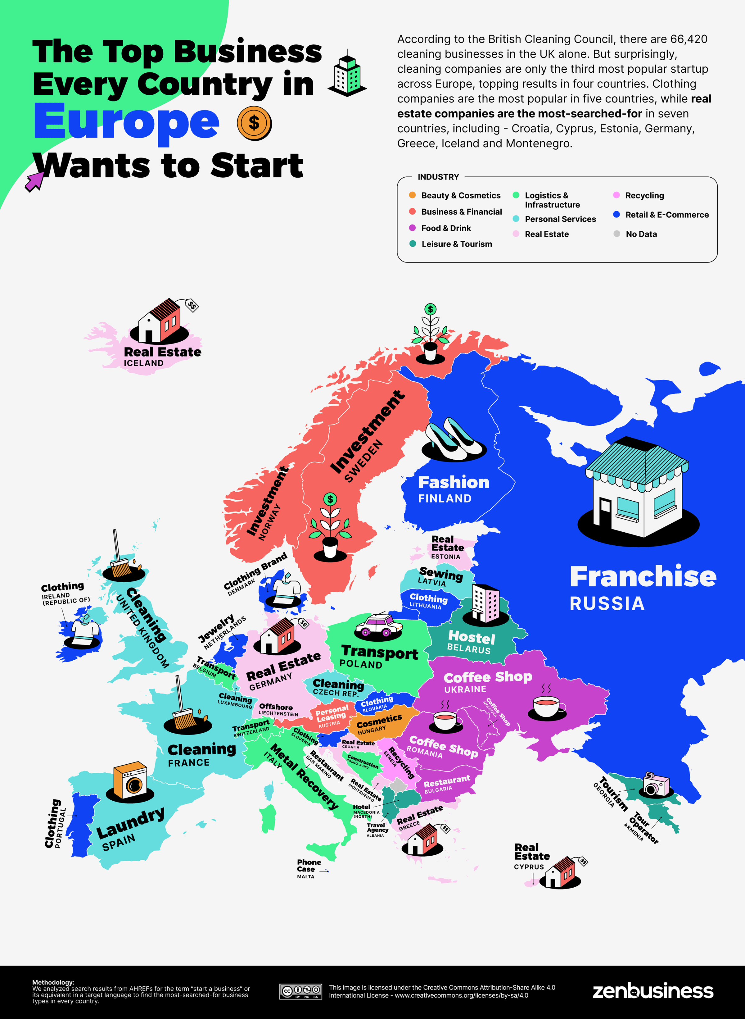영국 청소 협회에 따르면, 영국에만 66,420개의 청소 업체가 있다. 하지만 놀랍게도, 청소 회사는 4개국에서 1위를 차지하며 유럽에서 세 번째로 인기 있는 스타트업이다. 의류업체는 5개국에서 가장 인기 있고, 부동산업체는 크로아티아, 키프로스, 에스토니아, 독일, 그리스, 아이슬란드, 몬테네그로를 포함한 7개국에서 가장 많이 검색되었다.