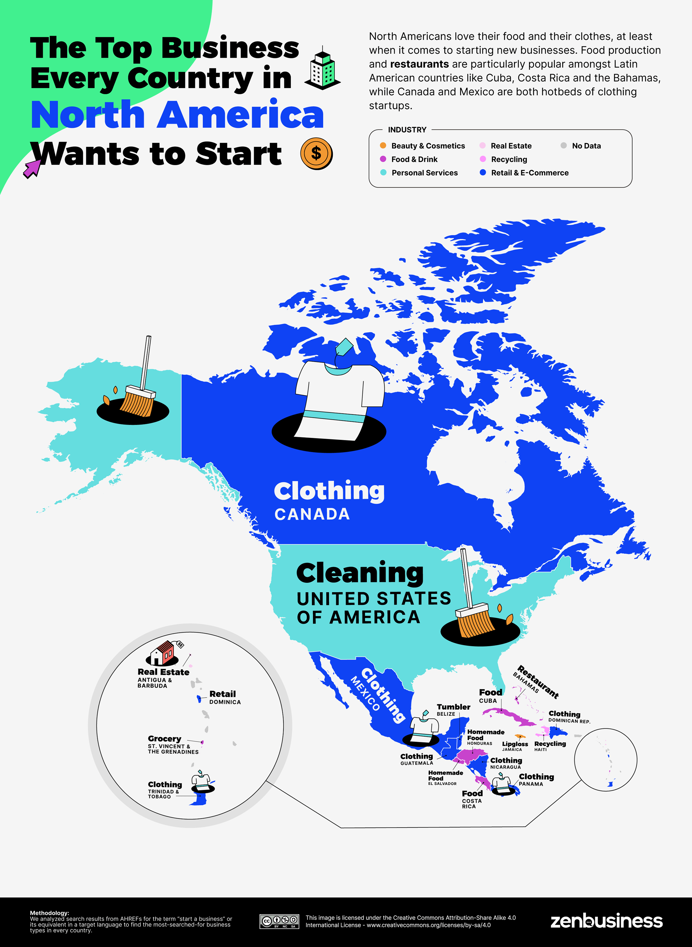 북미 사람들은 적어도 새로운 사업을 시작할 때 음식과 옷을 좋아한다. 식품 생산과 레스토랑은 쿠바, 코스타리카, 바하마와 같은 라틴 아메리카 국가에서 입소문이 나고, 캐나다와 멕시코는 의류 스타트업의 온상이다.