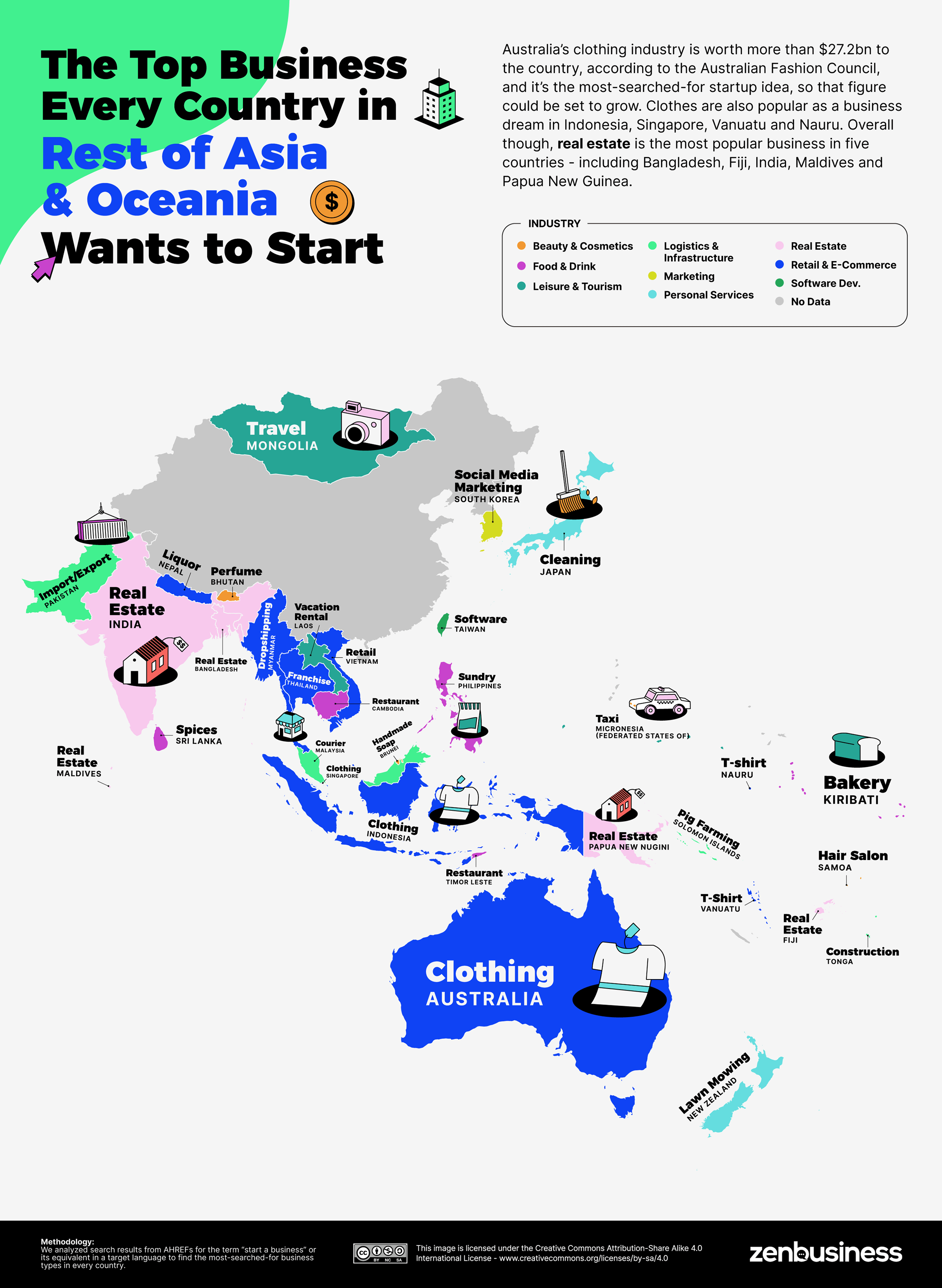 호주 패션 협회에 따르면, 호주의 의류 산업은 나라에서 272억 달러 이상의 가치가 있으며 가장 많이 검색된 스타트업 아이디어이기 때문에 그 수치는 성장할 수 있을 것이라고 한다. 의류는 인도네시아, 싱가포르, 바누아투, 나우루에서도 꿈꾸는 사업으로 인기가 있다. 부동산은 방글라데시, 피지, 인도, 몰디브, 파푸아 뉴기니 등 5개국에서 가장 인기 있는 사업이다.