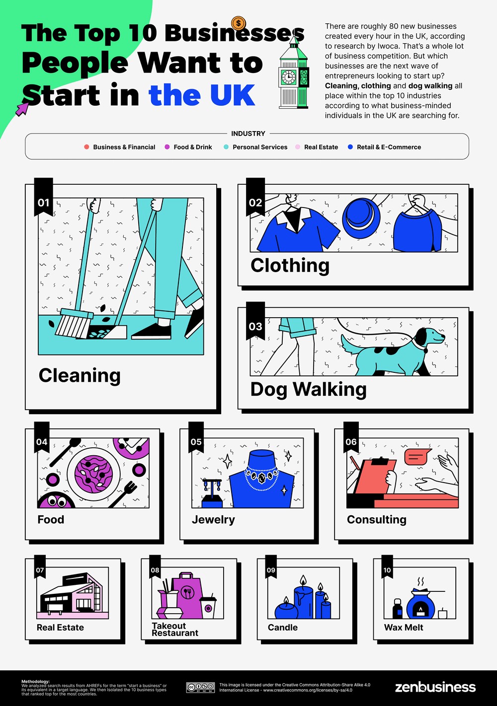 Iwoca의 연구에 따르면 영국에서는 매 시간 대략 80개의 새로운 사업이 창출된다. 정말 많은 비즈니스 경쟁이다. 그러나 차세대 사업가들은 어떤 회사를 창업하고 싶어 하는가? 영국에서 사업 마인드를 가진 사람들이 찾는 항목에 따르면, 청소, 의류, 그리고 반려견 산책 모두가 상위 10개 산업 내에 속한다.
