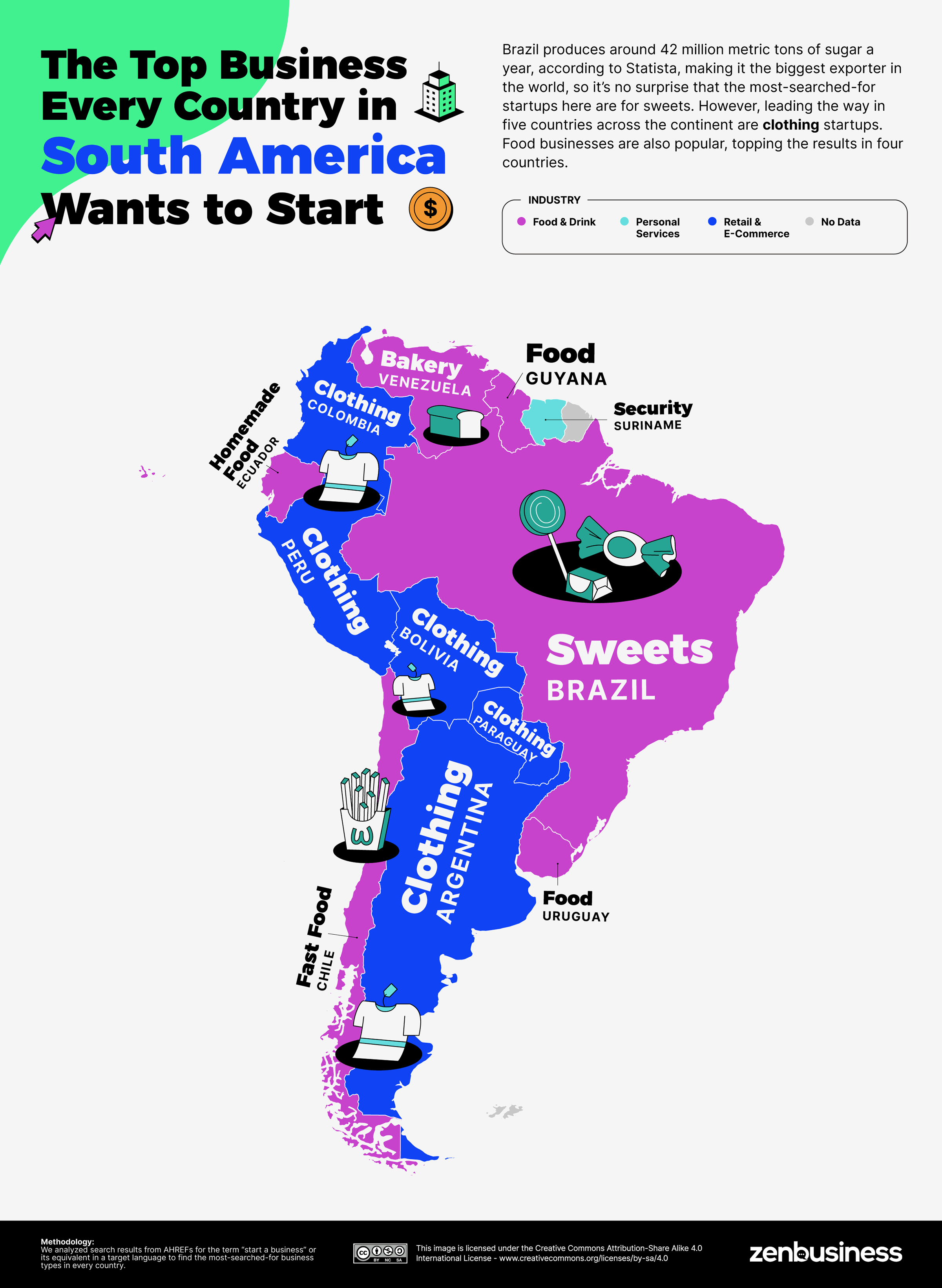 Statista에 따르면 브라질은 연간 약 4,200만 톤의 설탕을 생산하는 세계에서 가장 큰 수출국이기 때문에, 국내에서 가장 많이 찾는 스타트업이 제과 분야라는 것은 놀라운 일이 아니다. 하지만, 의류 스타트업이 대륙 5개 국가에서 선두를 달리고 있다. 식품 사업도 인기가 높아 4개국에서 1위를 차지했다.