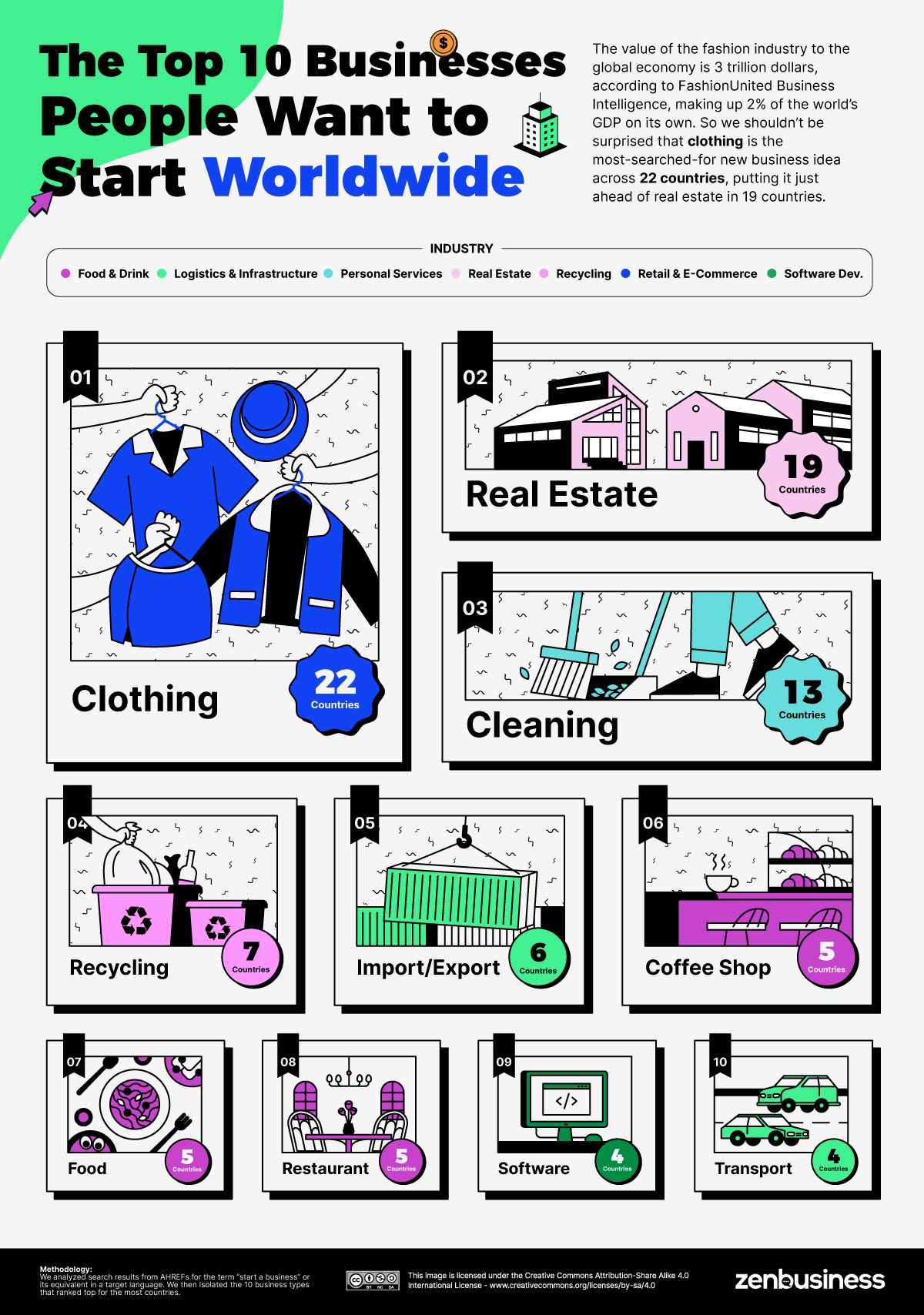 마지막으로 ZenBusiness는 국가의 데이터 세트에서 고유한 키워드 유형을 발생 횟수에 따라 내림차순으로 순위를 매겨 "전 세계 상위 10가지"를 계산했다.