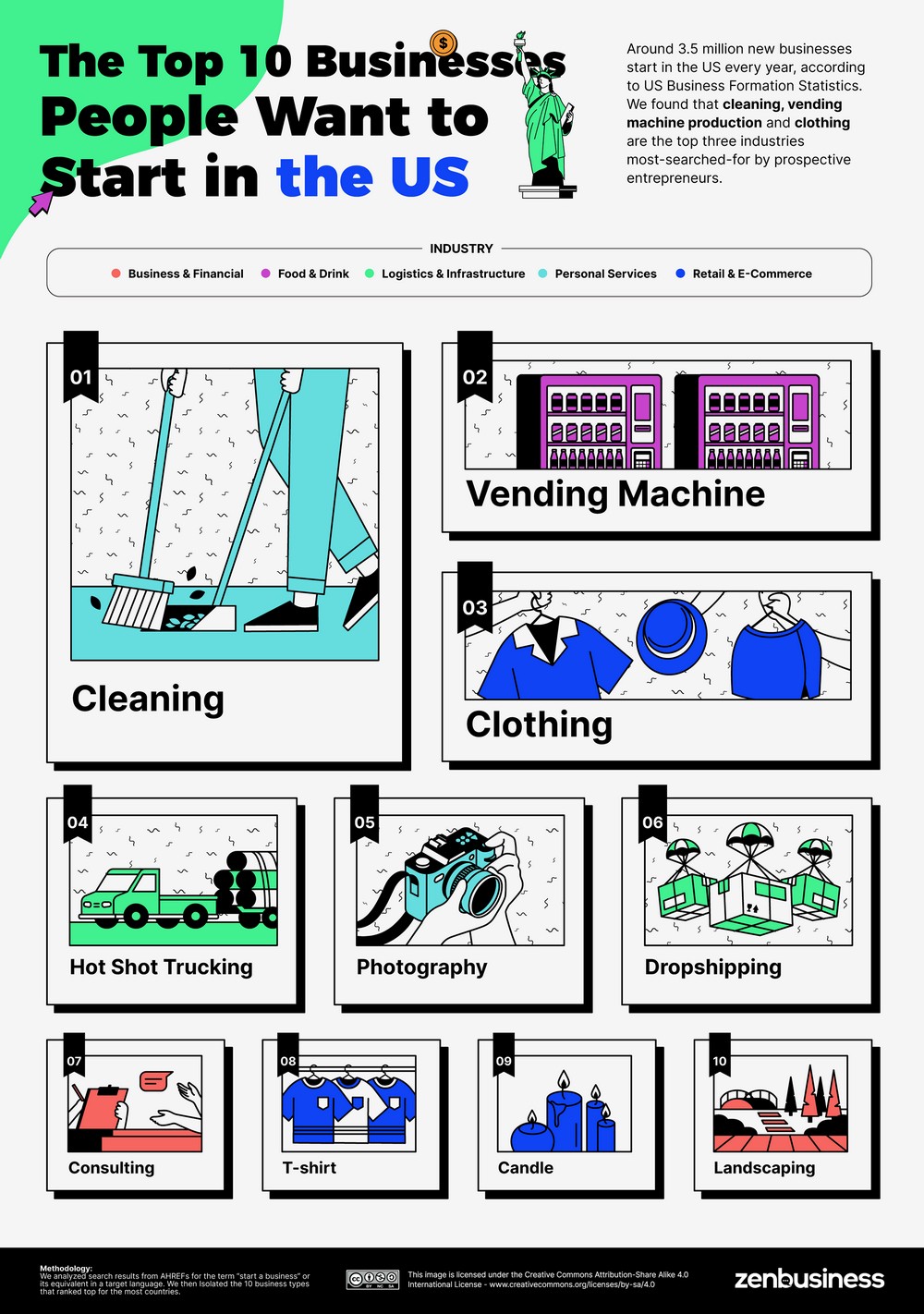 미국 비즈니스 형성 통계에 따르면, 매년 약 350만 개의 새로운 사업이 미국에서 시작된다. 청소, 자판기 생산 및 의류가 예비창업자가 가장 많이 찾는 3대 산업인 것으로 나타났다.