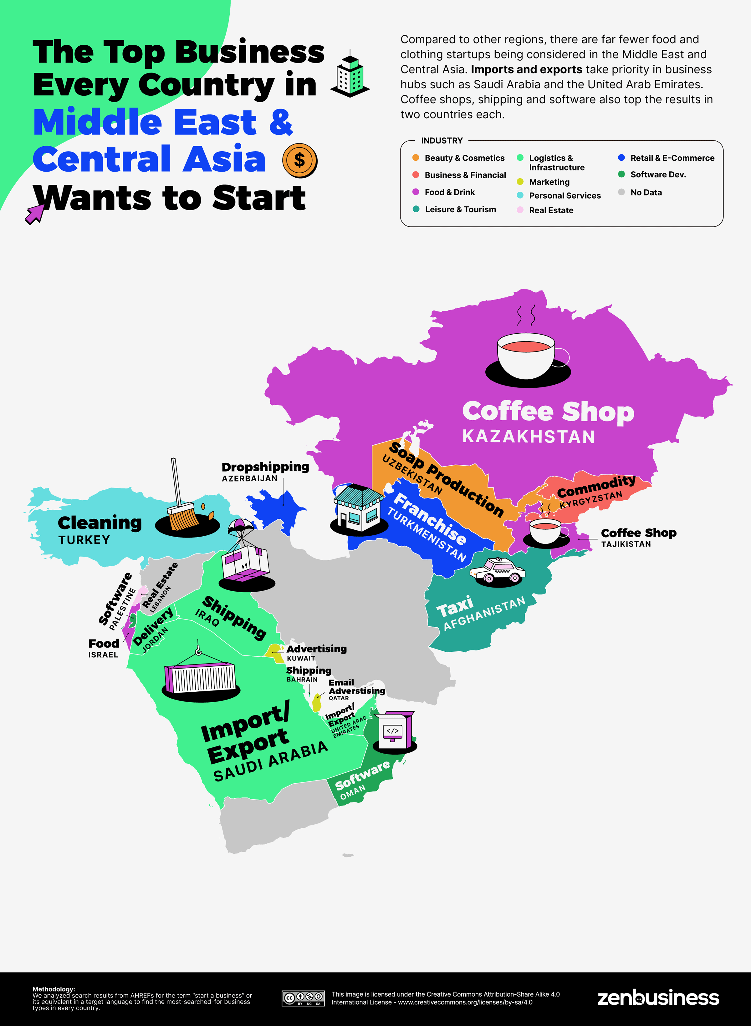 다른 지역에 비해 중동 및 중앙아시아에서는 식품 및 의류 스타트업이 훨씬 적게 검토되고 있다. 수출입은 사우디아라비아와 아랍에미리트와 같은 비즈니스 거점을 우선시한다. 커피숍, 배송, 소프트웨어도 각각 두 나라에서 1위를 차지했다.