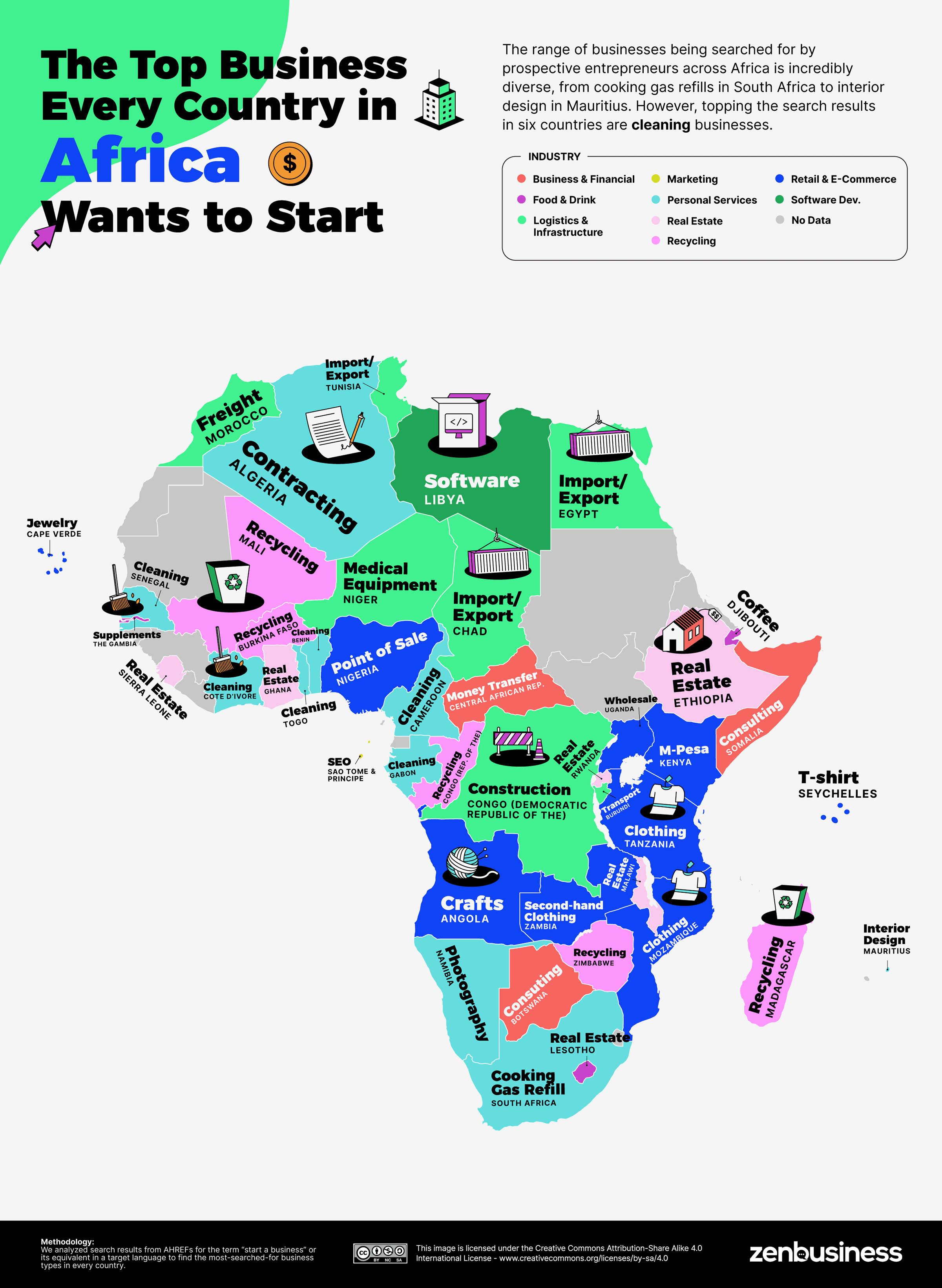 아프리카 전역의 예비 사업가들이 찾고 있는 사업 범위는 남아프리카 공화국의 조리용 가스 충전부터 모리셔스의 인테리어 디자인에 이르기까지 믿을 수 없을 만큼 다양하다. 그러나 6개국에서 검색 결과 1위는 청소업종이다.