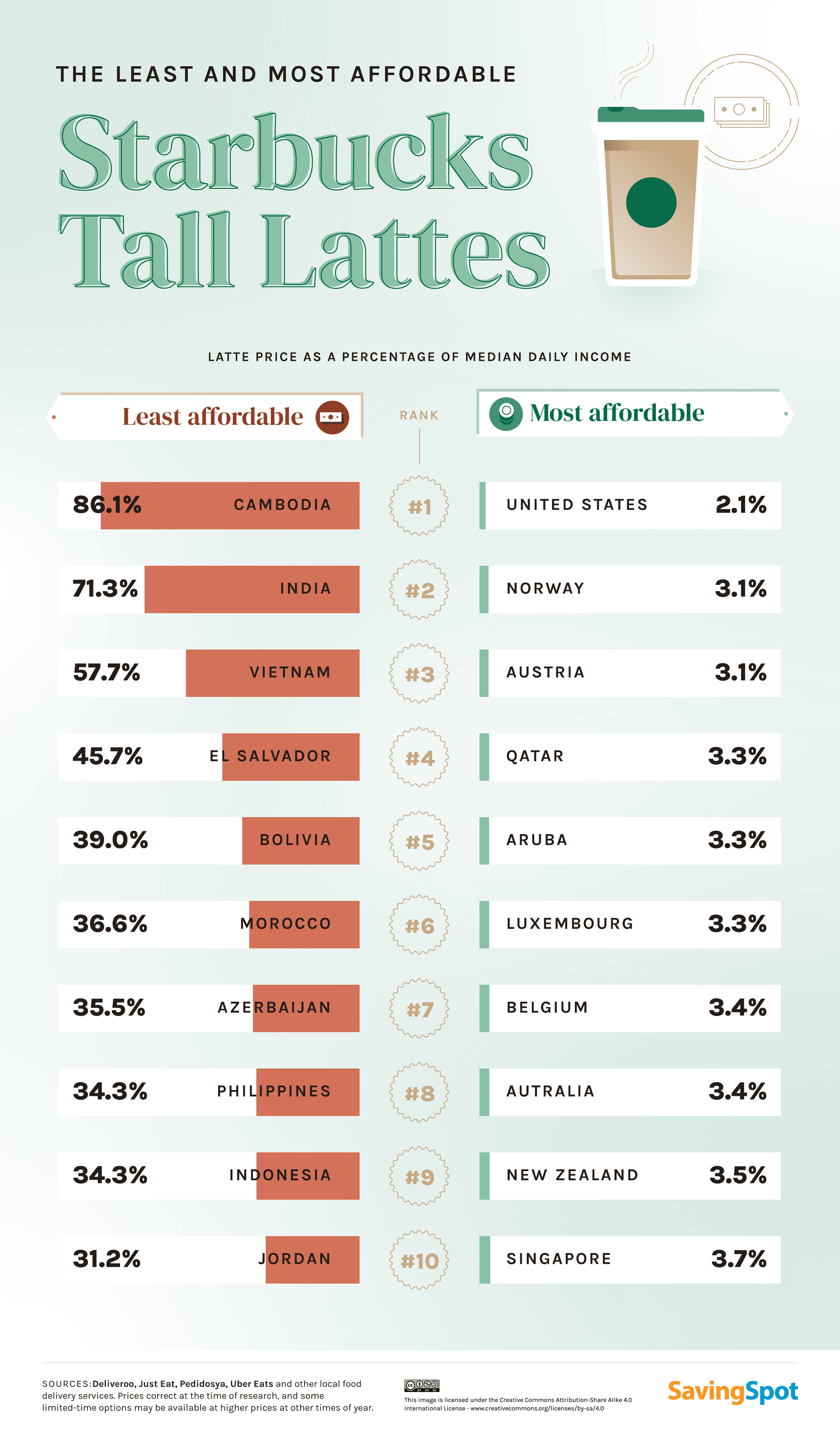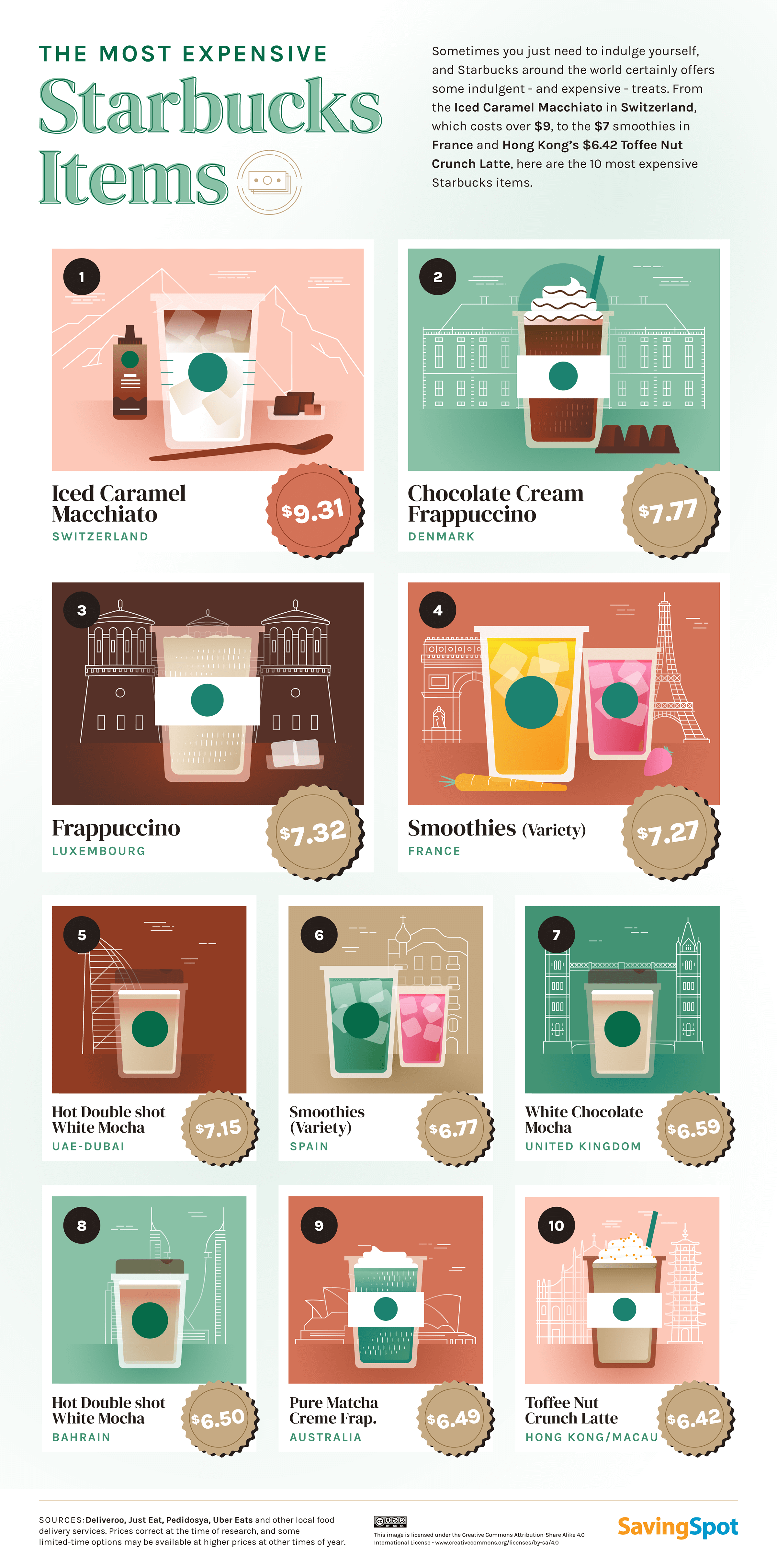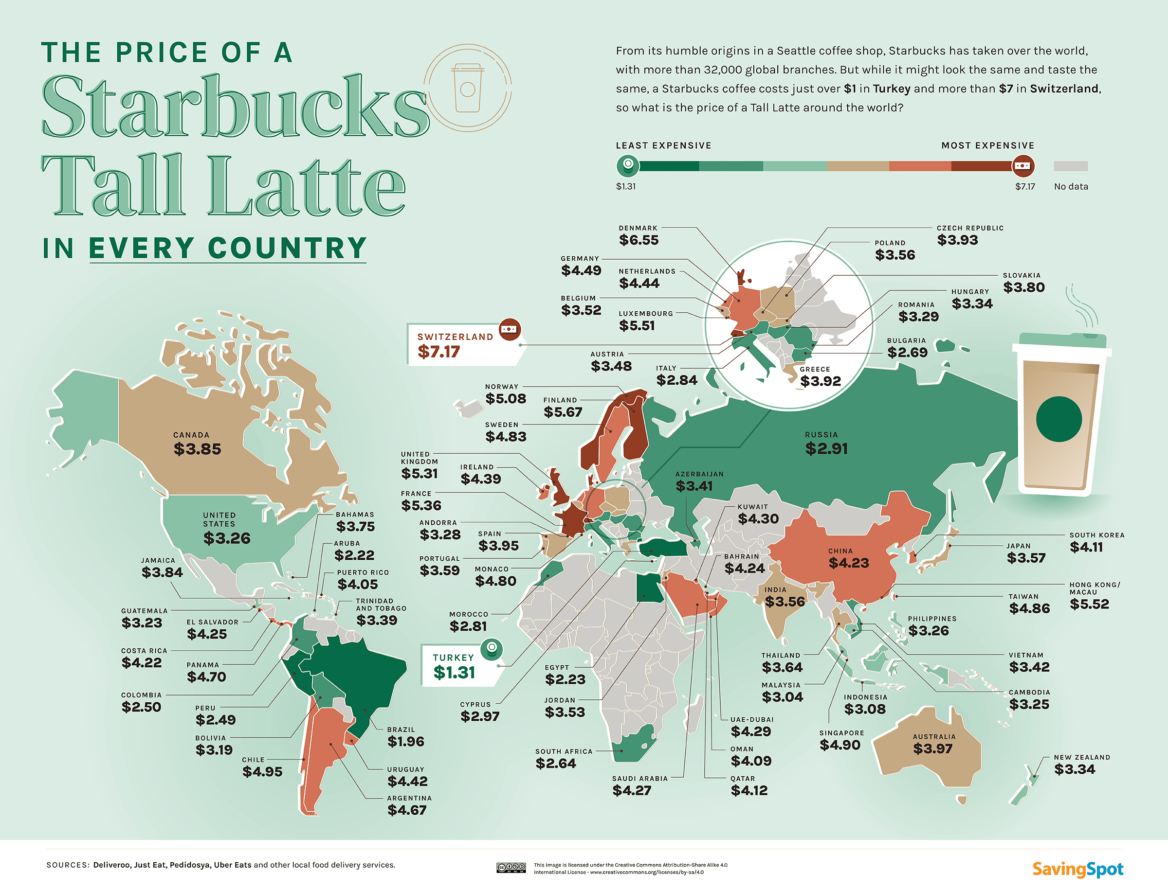 의심할 여지없이, 스위스는 이웃한 덴마크, 룩셈부르크, 프랑스에 프라푸치노를 7달러에 내놓은 밉보인 것을 부드럽게 하는 유럽의 '부유한 지대'의 잠금장치이다. 스페인과 영국은 가장 비싼 스타벅스 품목에 대해 유럽 상위 10개국 중 6위 밖으로 들었다.