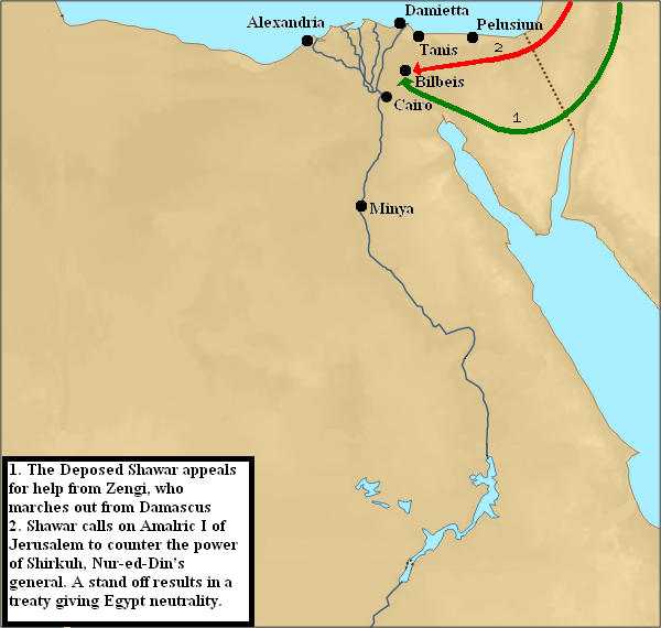 1168-1169년까지 십자군의 제4차 이집트 침공을 묘사한 지도. 이 침공은 시르쿠와 살라딘(1137-1193년)의 지도 아래 젱기 왕조의 이집트 정복으로 이어졌다.