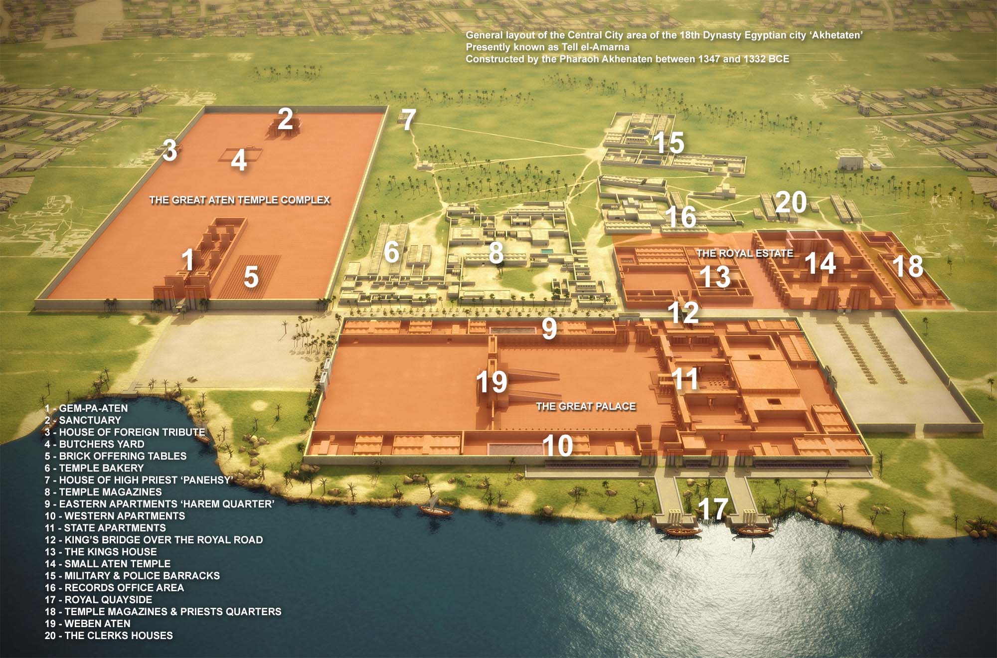 BC 1347-1332년 사이에 파라오 아크나톤이 건설한 제18왕조의 이집트 도시 "아케나텐"(현재 텔 엘-아마르나로 알려짐)의 중앙 도시 지역의 일반적인 배치를 나타낸 지도.