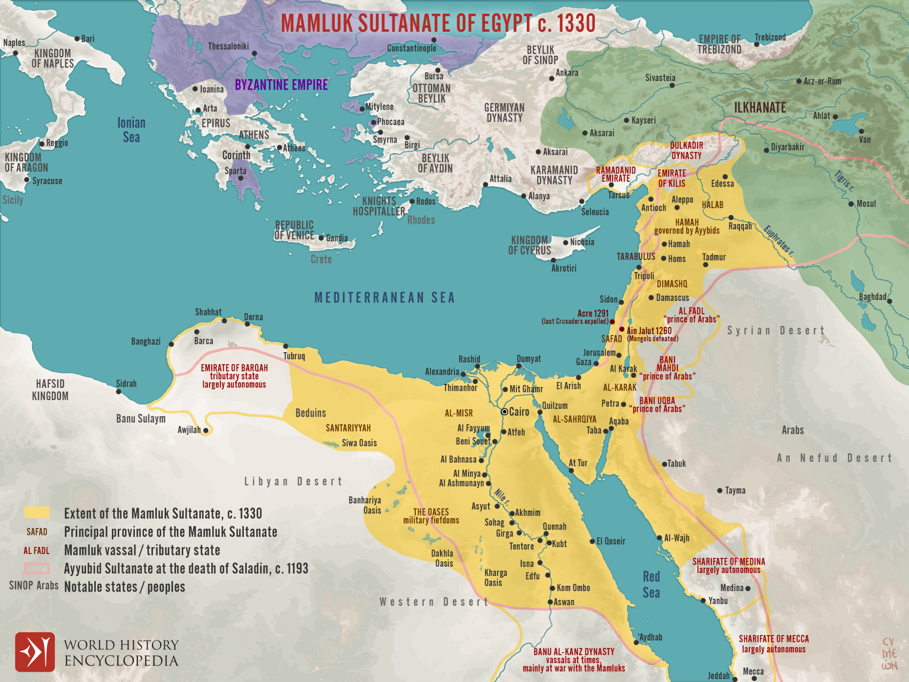 아이유브 왕조 지배자에 대한 노예 군대의 반란을 시작으로 내부 격동과 투쟁의 타당한 몫을 통해 이집트와 레반트, 시리아, 히자즈에 이르는 영토를 지배하고, 오스만 제국에 의해 정복될 때까지 2세기 이상(1250-1517년) 지속된 중세 후기의 가장 강력하고 부유한 국가 중 하나인 맘루크 술탄국의 부상과 발전을 나타낸 지도.