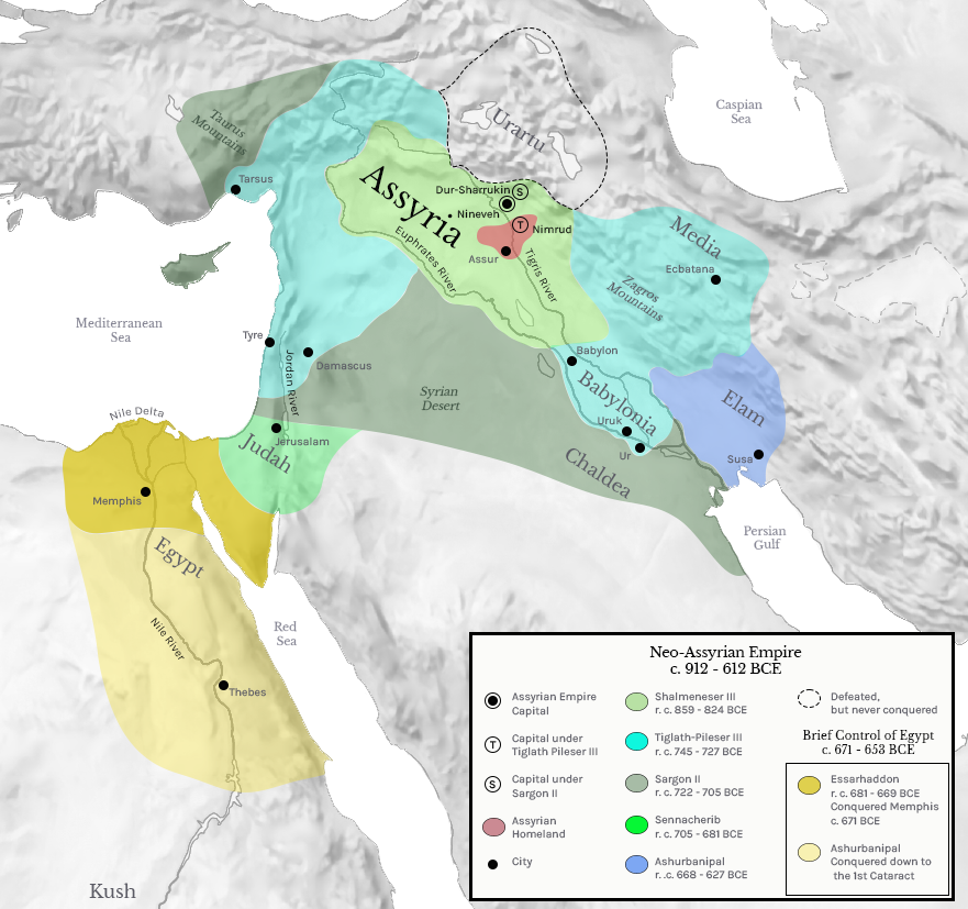 BC 912-612년경 신아시리아 제국 지도는 샬마네세르 3세(재위 859-824년경), 티글라트필레세르 3세(재위 722-705년경), 사르곤 2세(재위 722-705년경), 센나케립(재위 705-681년경), 아슈르바니팔(재위 688-627년경)의 확장을 보여준다. 이 시기에는 전문 군대의 손에 있는 치명적인 효과의 철제 무기 및 갑옷과 니네베 도서관에서 발견된 것과 같은 방대한 지식의 수집이 이루어졌다.