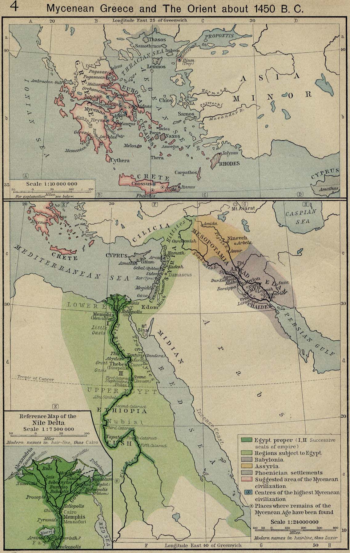 BC 1450년경 미케나이 그리스와 오리엔트. 나일 삼각주의 참조 지도가 포함되어 있다.