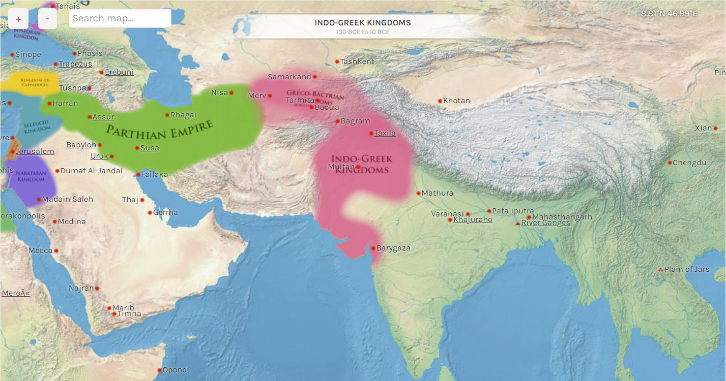 BC 130년 인도 그리스 왕국(야바나 왕국)의 범위