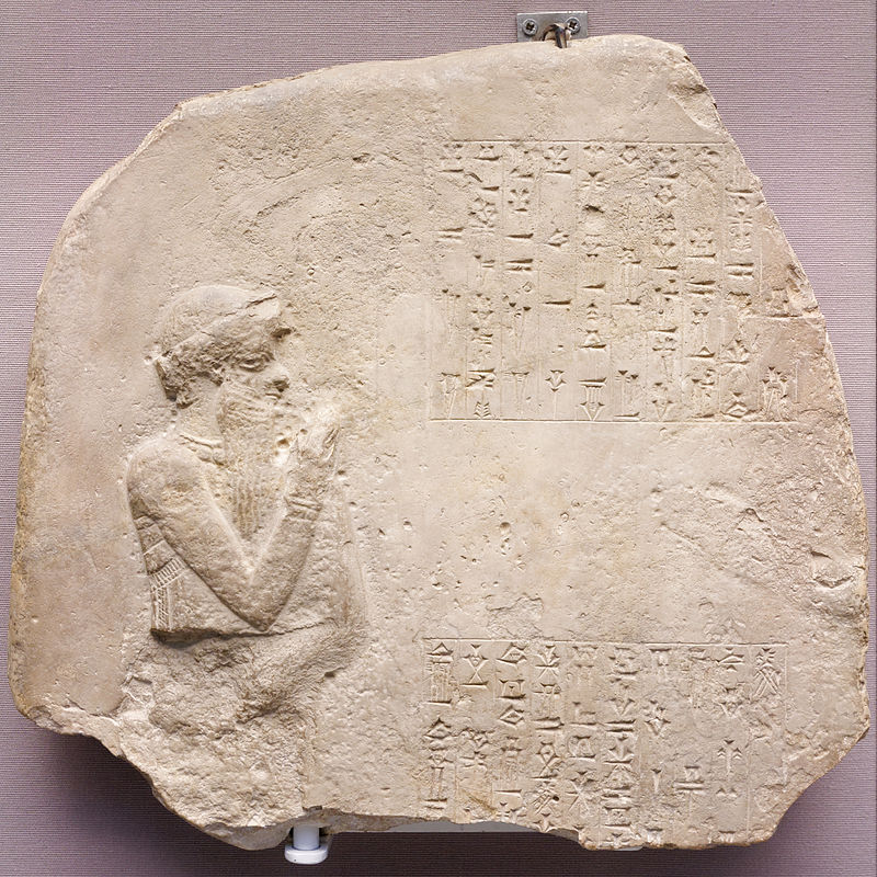 함무라비가 오른팔을 들고 경배하는 모습의 석회암 봉헌 기념비, BC 1792-1750년경, 이라크 시파르에서 출토
